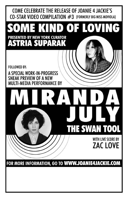 Performing artist and videomaker Miranda July performs sneak previews excerpted from her new multi-media performance (The Swan Tool) with original live score by Zac Love.