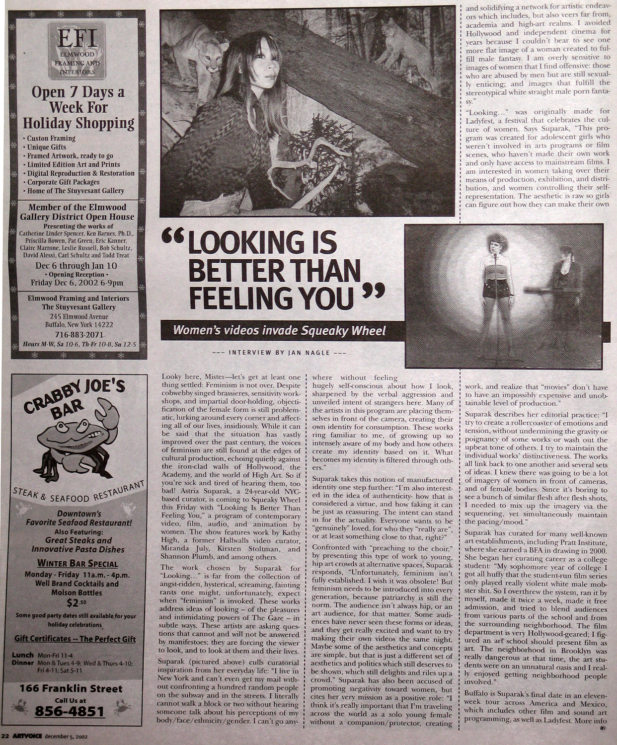 Astria Suparak, a 24-year-old NYC-based curator, is coming to Squeaky Wheel this Friday with Looking is better than feeling you, a program of contemporary video, audio, and animation by women. The show features work by Kathy High, a former Hallwalls video curator, Miranda July, Kirsten Stoltmann, and Shannon Plumb, among others.