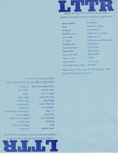 LTTR#2_release_flyer_Andrew-Kreps-Gallery November 10, 2015 Return to: LTTR #2: LISTEN TRANSLATE TRANSLATE RECORDFull resolution (461 × 600) Image navigation Previous Image Poster for LTTR#2 release at Andrew Kreps Gallery, New York, Aug. 28, 2003