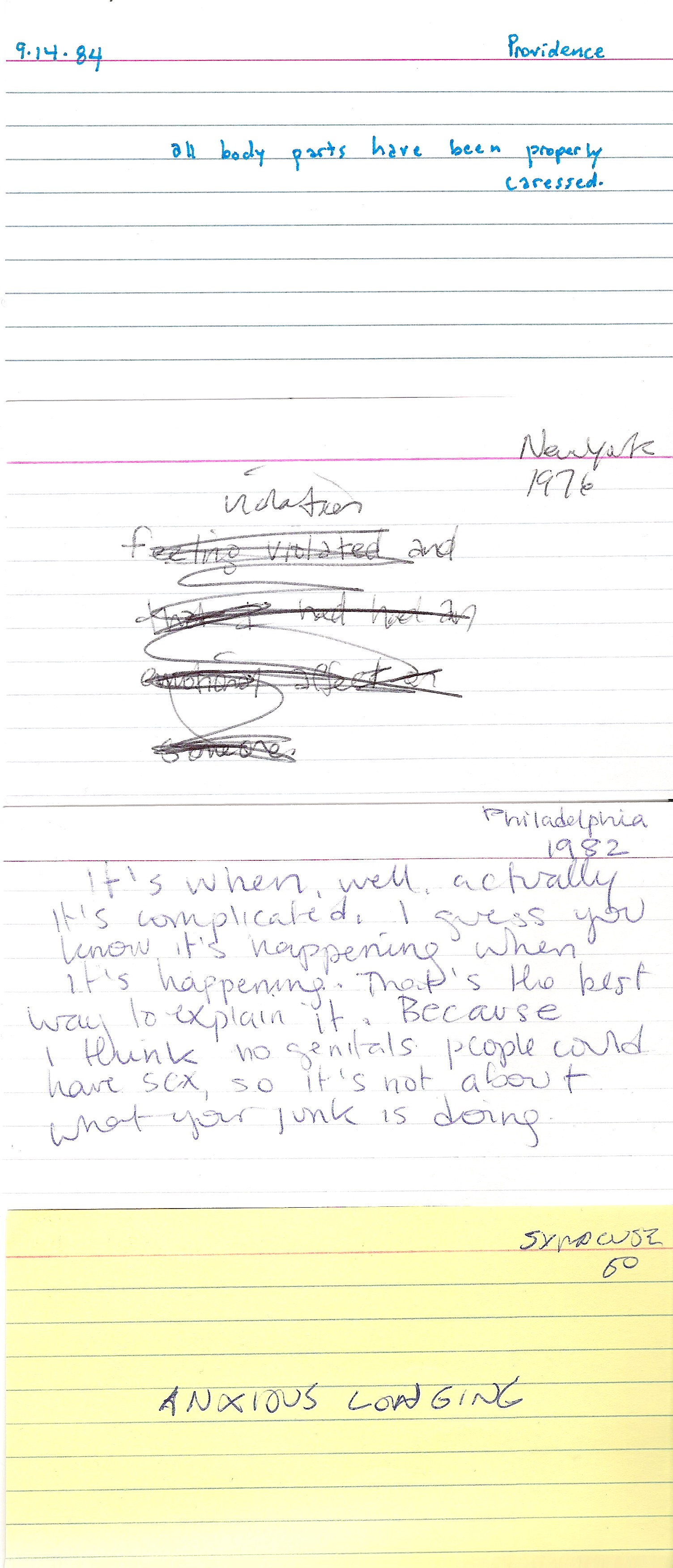 "all body parts have been properly caressed" - Providence, 1984 / "violation" - New York, 1976 / "It's when, well, actually it's complicated. I guess you know it's happening when it's happening. That's the best way to explain it. Because I think no genitals people could have sex, so it's not about what your junk is doing." - Philadelphia, 1982 / "ANXIOUS LONGING" - Syracuse, 1960