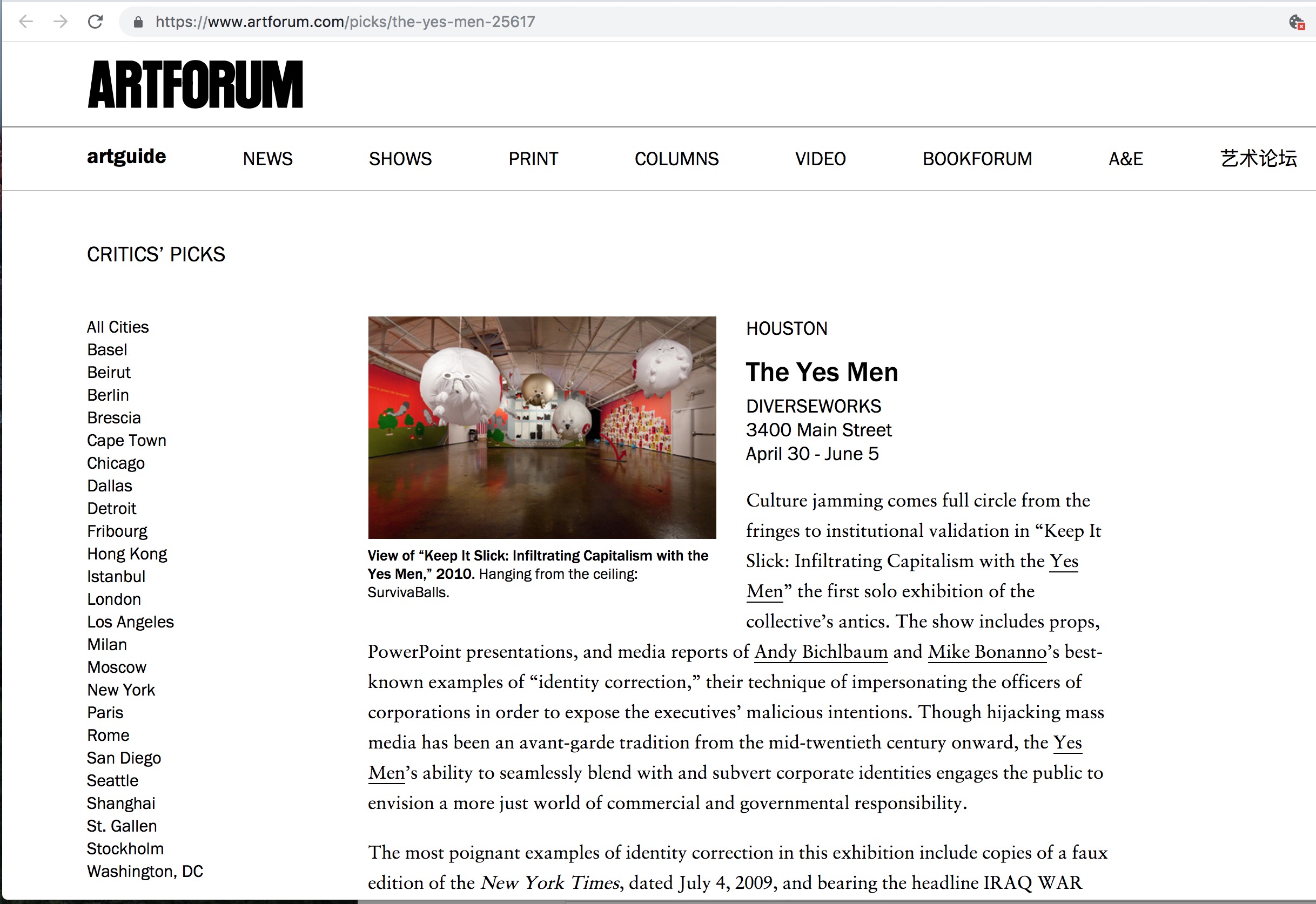 Screen Shot 2018-11-10 at 12.37.37 AM November 10, 2018 Return to: KEEP IT SLICK: Infiltrating Capitalism with The Yes MenFull resolution (2436 × 1674) Image navigation Previous Image Next Image Artforum Critic's Pick: "Keep It Slick"