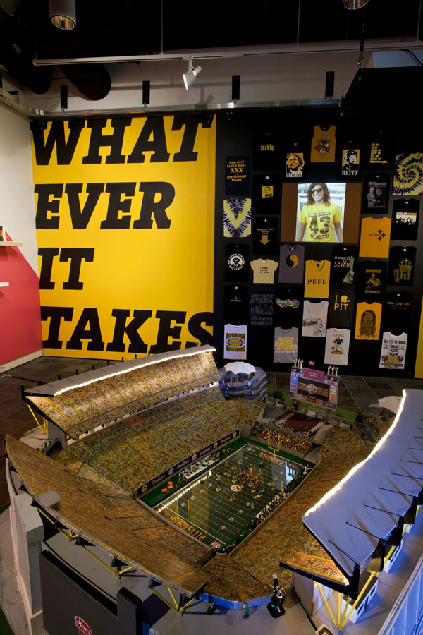 Installation photo of "Pittsburgh Electric Football Heinz Field," John and Shawna Evans and Rob Dalmasse, 2003 and display of unlicensed Steelers T-shirts, with slide show "Great Moments in Unlicensed Steelers T-shirts," Images courtesy of Pittsburgh Sports and Mini Ponies blog, video slide show, 2010.