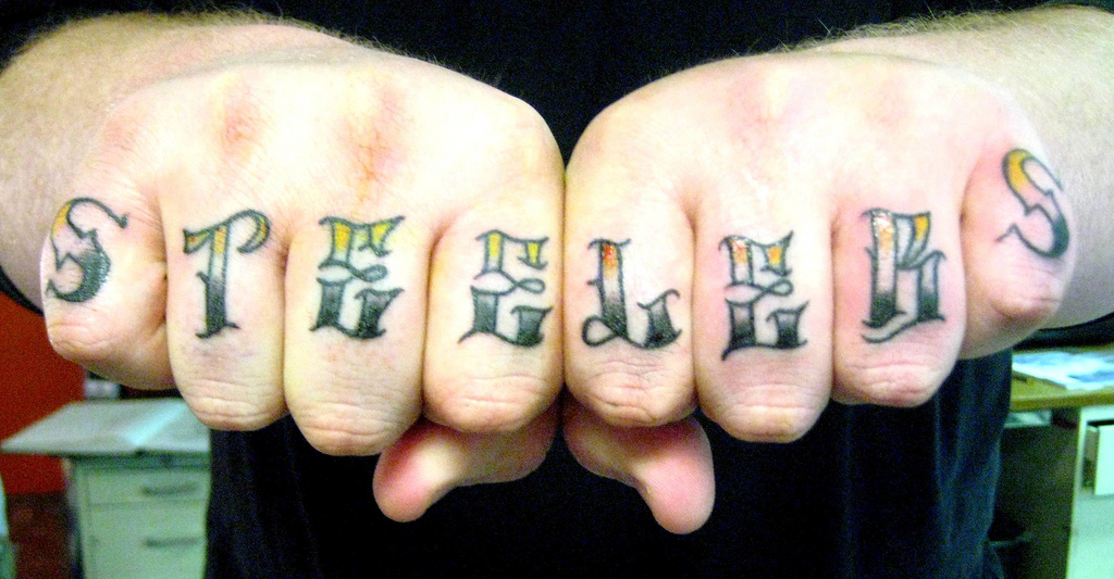 October 29, 2013 Return to: WHATEVER IT TAKES: Steelers Fan Collections, Rituals, and ObsessionsFull resolution (1024 × 533) Image navigation Previous Image Next Image Steelers knuckles tattoo, image courtesy of Matt Kugler.