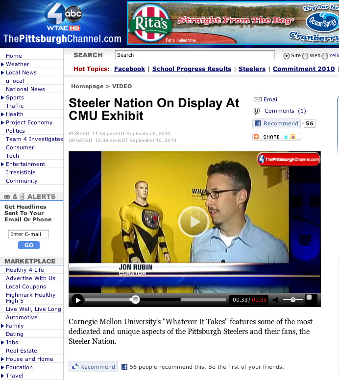 ABC_WIT-interview December 27, 2013 Return to: WHATEVER IT TAKES: Steelers Fan Collections, Rituals, and ObsessionsFull resolution (692 × 776) Image navigation Previous Image Next Image ABC Evening News, Top Story: "Steeler Nation on Display at CMU Exhibit" ABC Evening News, Top Story: “Steeler Nation on Display at CMU Exhibit”