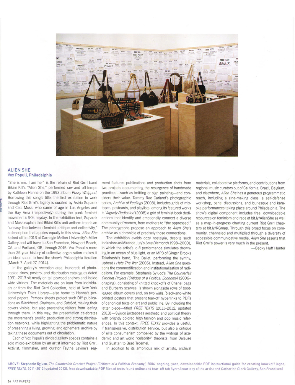 “In addition to its ambitious mix of artists, archival materials, collaborative platforms, and contributions from regional music curators out of California, Brazil, Belgium, and elsewhere, Alien She has a generous programmatic reach […] taking place around Philadelphia. The show’s digital component includes free, downloadable resources on feminism and race at bit.ly/AlienShe as well as a map-in-progress charting current Riot Grrrl chapters at www.bit.ly/RGmap.