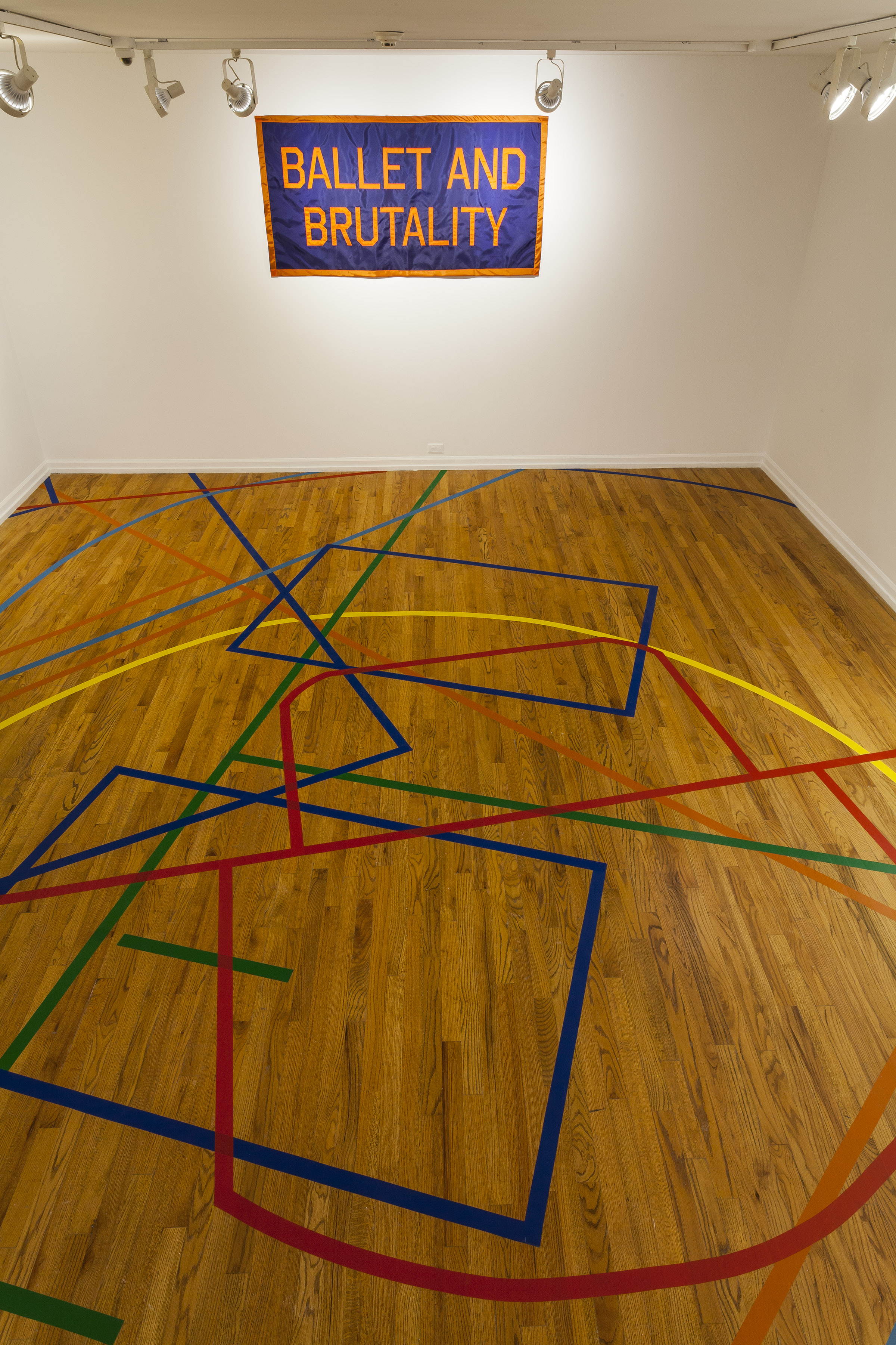 Goals is a floor installation that superimposes the goals of six major team sports into an actual-scale “color field” abstraction of hollow winning.