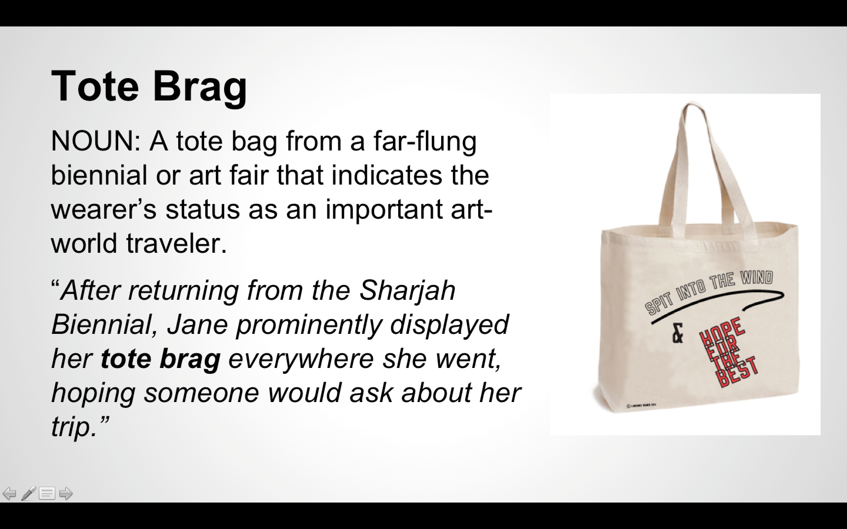 Lexicon_Tote-Brag June 1, 2015 Return to: WOMEN INC. LEXICONFull resolution (2880 × 1800) Image navigation Previous Image Next Image "Tote Brag" from the Women Inc. Lexicon