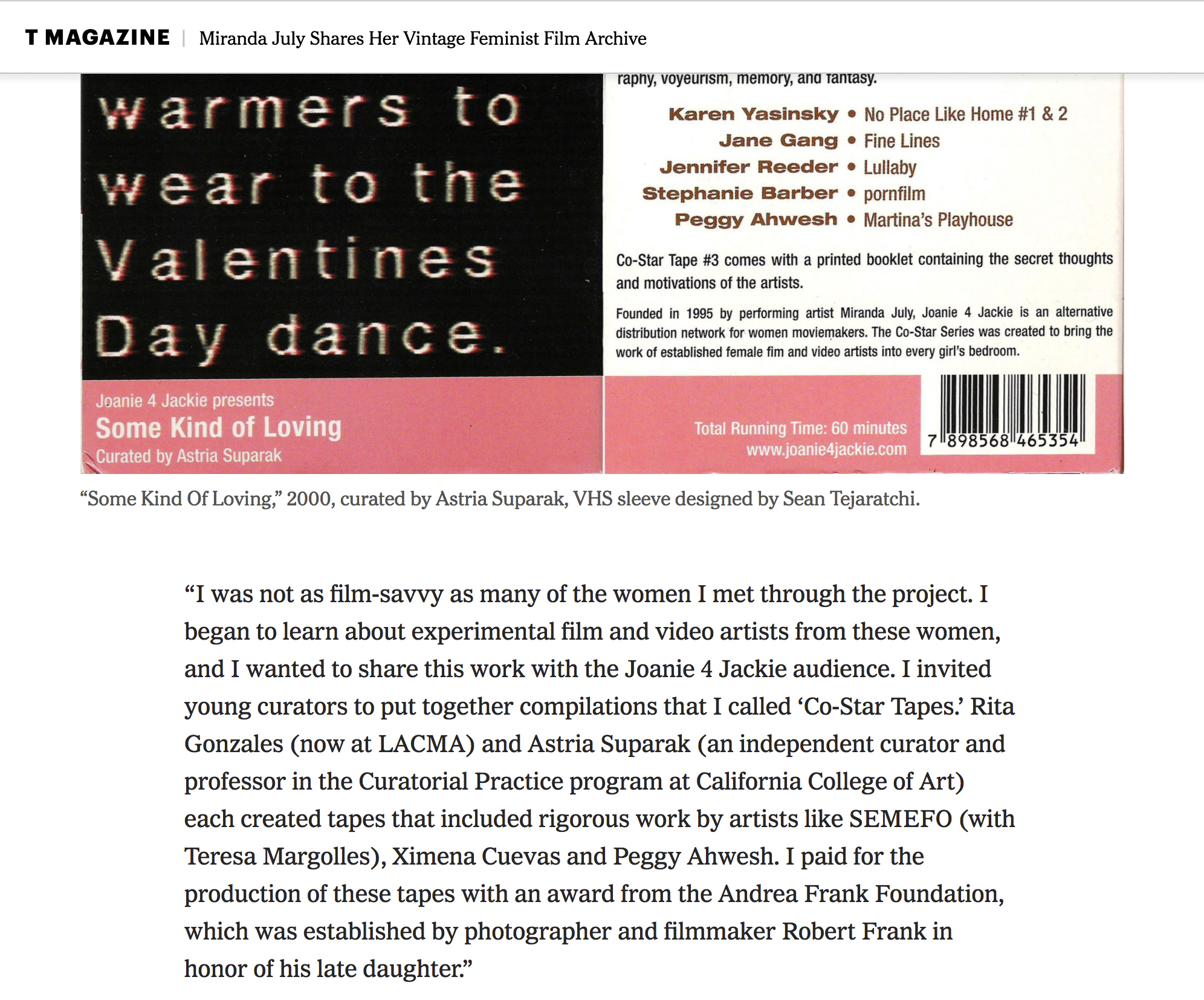 – “Miranda July Shares Her Vintage Feminist Film Archive,” Mary Kaye Schilling, January 30, 2017