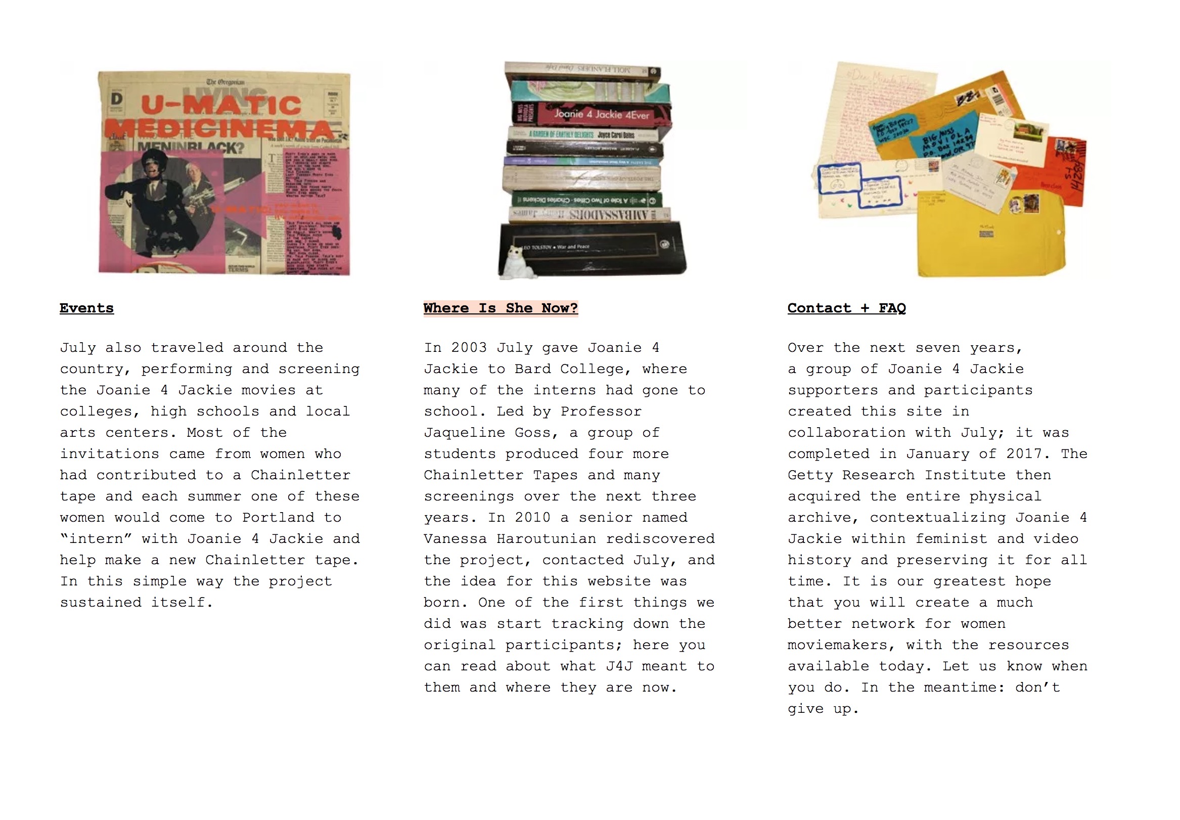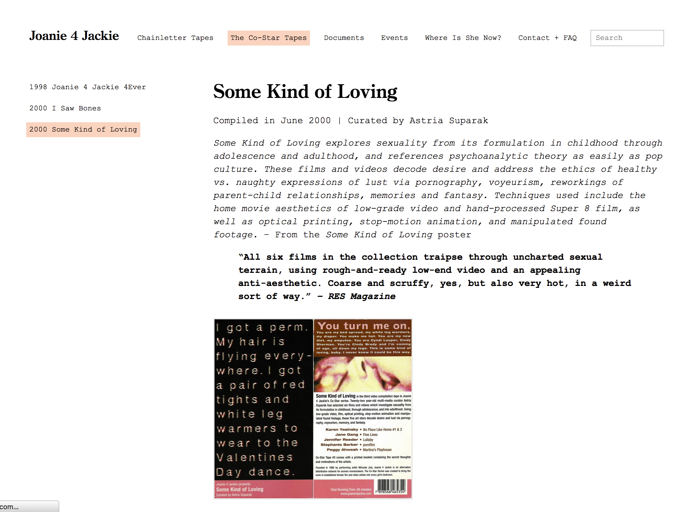 Throughout the last twenty years, my relationship to Joanie 4 Jackie has evolved from spectator to fan, consumer, event programmer, tour booker, distributor, historian, and curator. Below is a selection of artifacts spanning this time, now available along with the complete archive at joanie4jackie.com.”