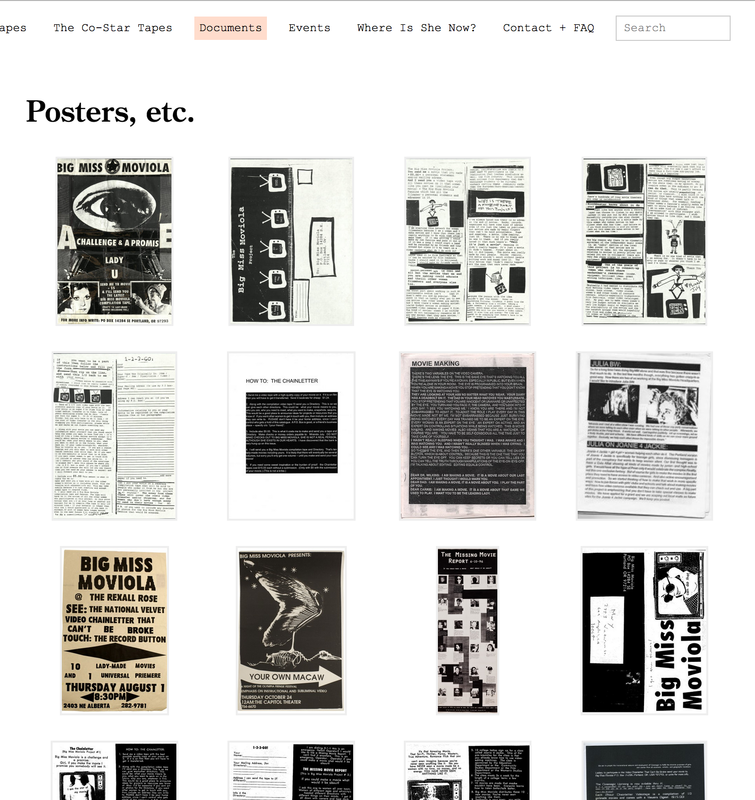 Joanie 4 Jackie (formerly known as Big Miss Moviola) was an underground film network formed by artist and filmmaker Miranda July in 1995. For more than a decade this project fomented a generation of women filmmakers — inspiring girls to make movies for the first time, circulating work by seasoned artists to places their distributors and gallerists couldn’t reach, documenting films that hadn’t yet been made, and connecting people across the country through booklets of letters that arrived with each videotape. By the time the project had run its course the work of over 200 filmmakers was distributed through 22 compilation tapes, and Joanie 4 Jackie exhibited from Vancouver to Monterrey to Ljubljana in spaces from punk clubs to the Museum of Modern Art. The complete J4J archive, consisting of video tapes, fliers, personal correspondence, grant applications, research notes, press materials, and other ephemera, has just been acquired by The Getty Research Institute. The GRI will make the archive accessible to all and it will be contextualized amongst other important artist and video archives, including The Woman’s Building, the Guerilla Girls, Yvonne Rainer, Carolee Schneemann, Robert Mapplethorpe, and Eleanor Antin.
