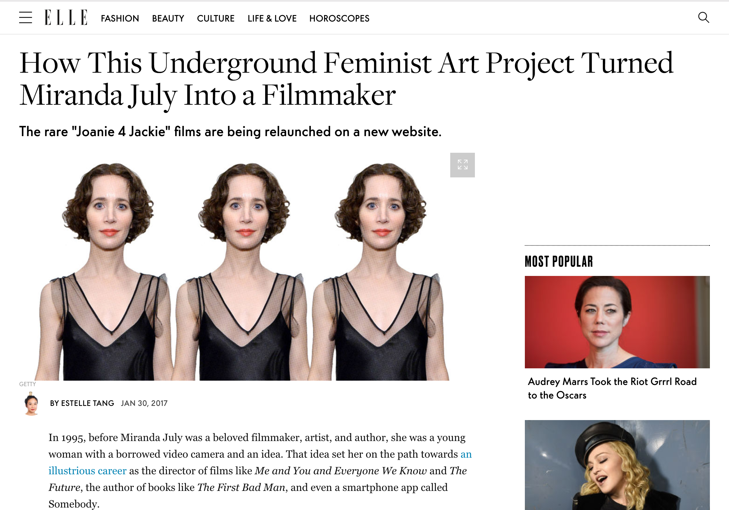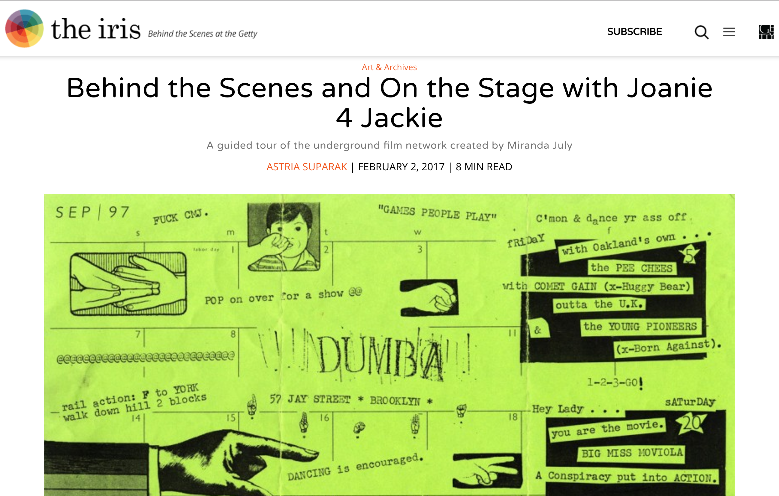 – “How This Underground Feminist Art Project Turned Miranda July Into a Filmmaker: The rare “Joanie 4 Jackie” films are being relaunched on a new website,” Estelle Tang, January 30, 2017