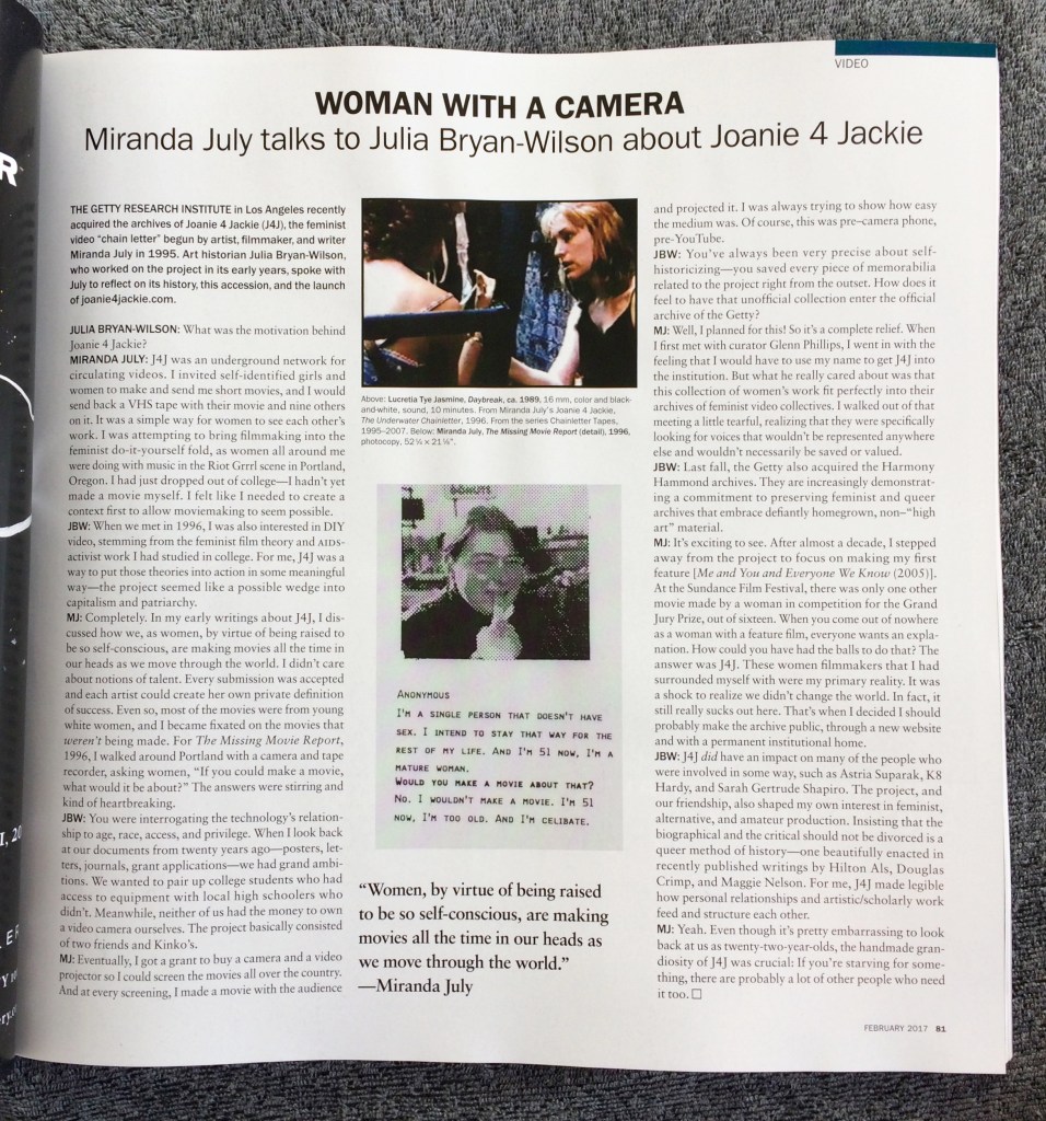 JBW: J4J did have an impact on many of the people who were involved in some way, such as Astria Suparak, K8 Hardy, and Sarah Gertrude Shapiro. The project, and our friendship, also shaped my own interest in feminist, alternative, and amateur production. Insisting that the biographical and the critical should not be divorced is a queer method of historyโone beautifully enacted in recently published writings by Hilton Als, Douglas Crimp, and Maggie Nelson. For me, J4J made legible how personal relationships and artistic/scholarly work feed and structure each other.