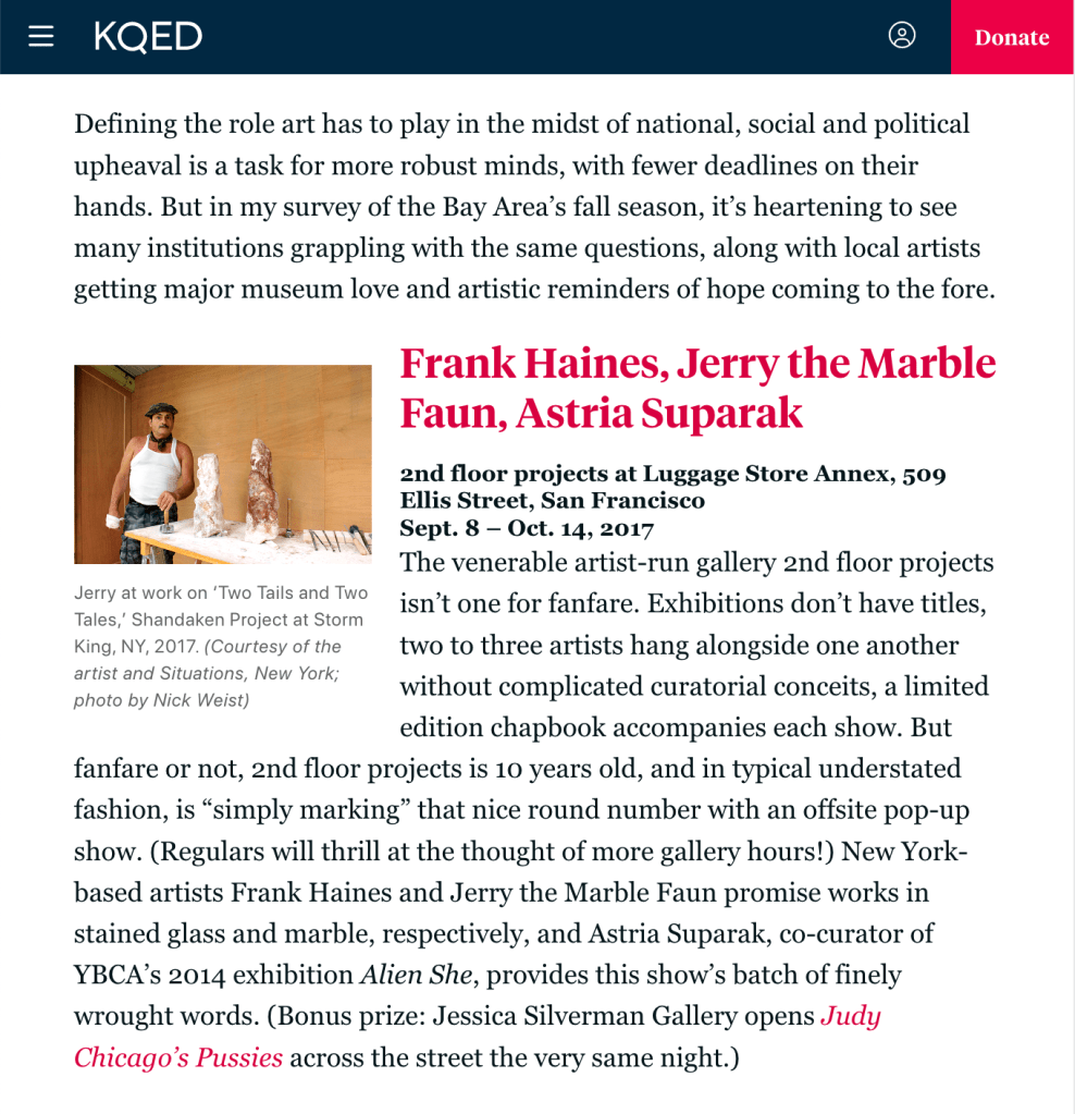 “The venerable artist-run gallery 2nd floor projects isnโt one for fanfare. Exhibitions donโt have titles, two to three artists hang alongside one another without complicated curatorial conceits, a limited edition chapbook accompanies each show. But fanfare or not, 2nd floor projects is 10 years old, and in typical understated fashion, is ‘simply marking’ that nice round number with an offsite pop-up show. New York-based artists Frank Haines and Jerry the Marble Faun promise works in stained glass and marble, respectively, and Astria Suparak, co-curator of YBCAโs 2014 exhibition Alien She, provides this showโs batch of finely wrought words.”