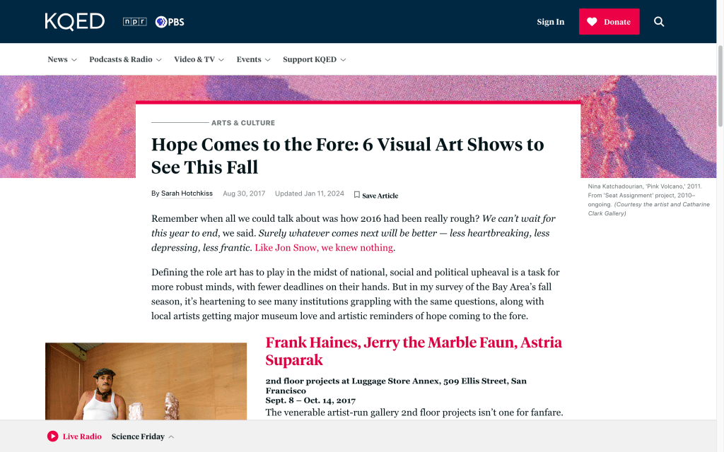 – Sarah Hotchkiss, “Hope Comes to the Fore: 6 Visual Art Shows to See This Fall,” Aug. 30, 2017