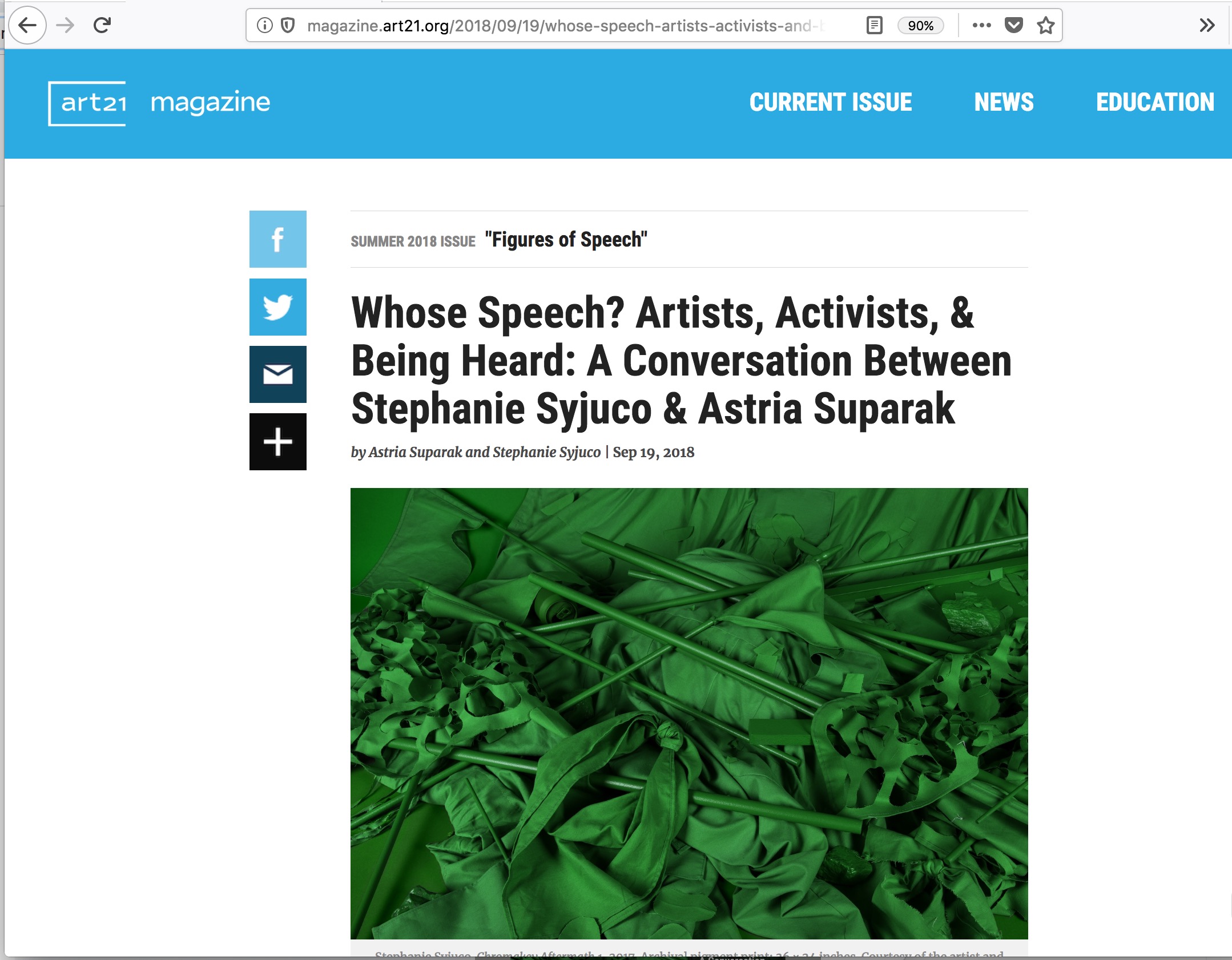 Art21_SS-AS_screenshot_Oct2018 October 8, 2018 Return to: Art21 conversation with Stephanie SyjucoFull resolution (2158 × 1682) Image navigation Previous Image Screengrab of "Whose Speech? Artists, Activists, and Being Heard," Art21 Magazine, Sept. 2018