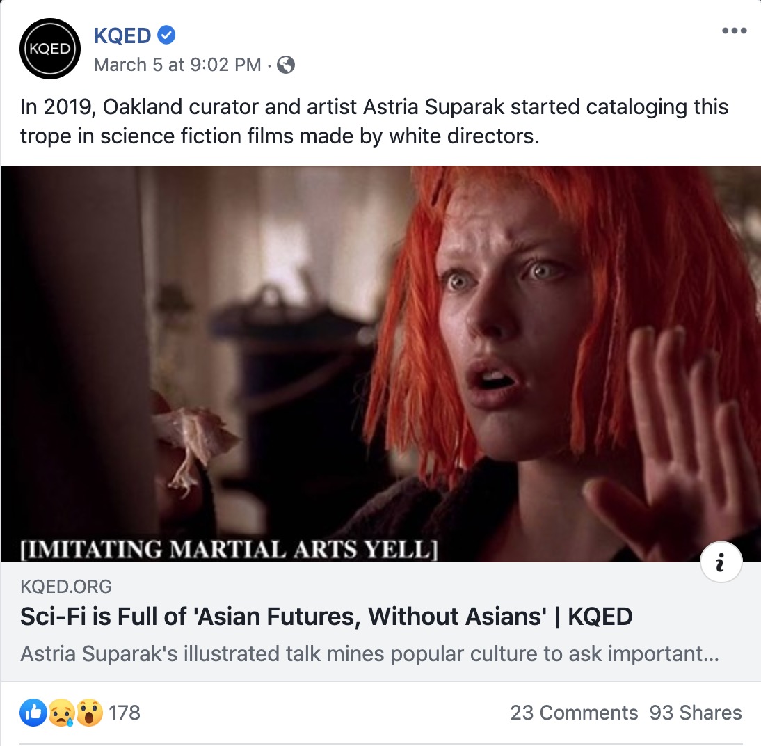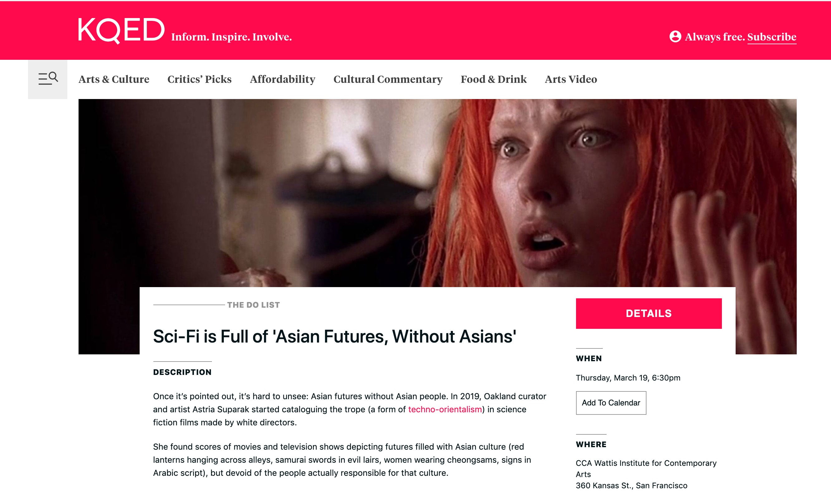KQED, “Sci-Fi is Full of ‘Asian Futures, Without Asians’,” THE DO LIST, Sarah Hotchkiss, March 2020