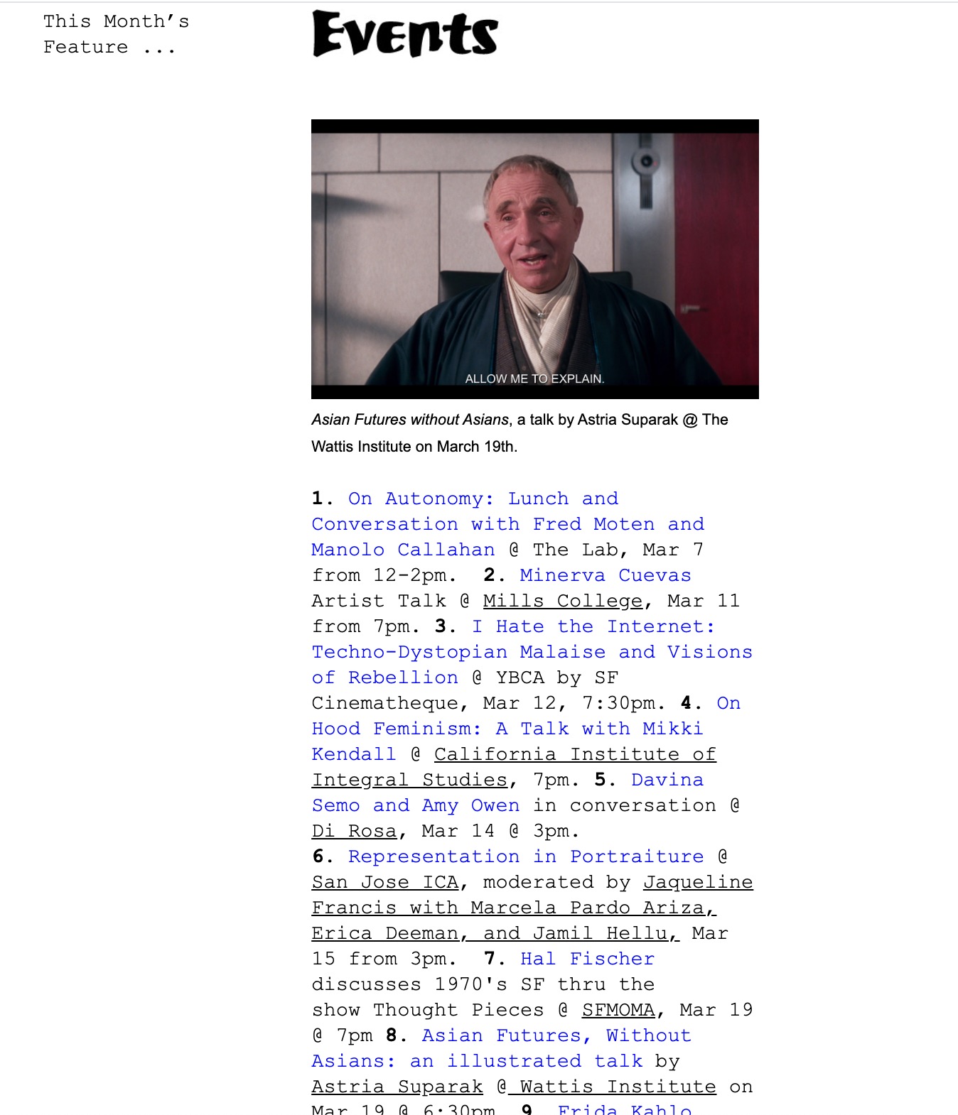 Virtually Asian is just one shard of a larger research project that examines over 40 years of American science fiction cinema and television from a critical lens. The presentations of her results are diffuse: the video at Berkeley Art Center, a forthcoming ontological essay on the conical hat, troughs of materials culled from fan sites and military wikis, illustrated essays, screenshots from Bladerunner and Ghost in the Shell and a possible series of GIFs. […]