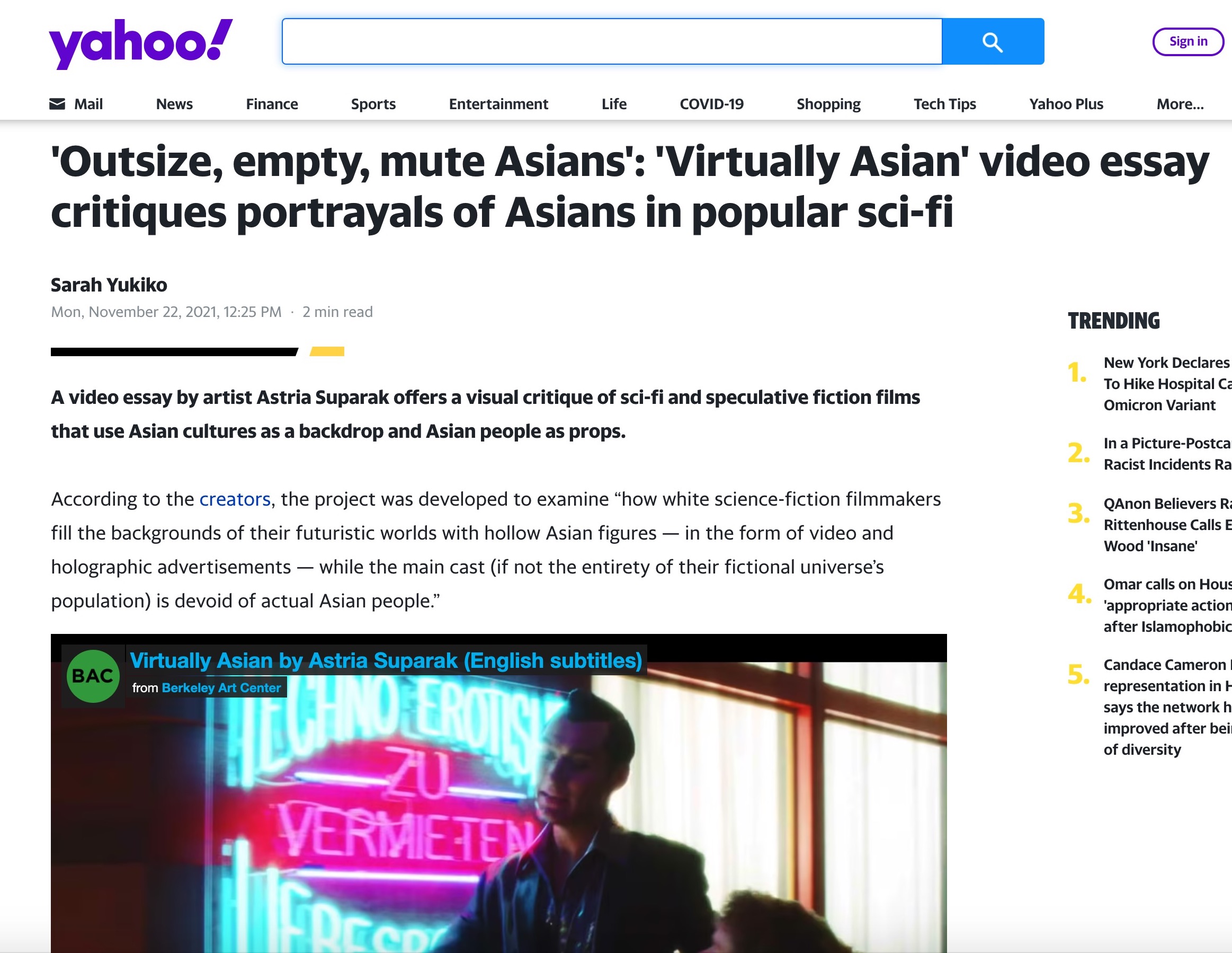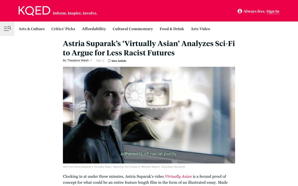 KQED, “Astria Suparak’s ‘Virtually Asian’ Analyzes Sci-Fi to Argue for Less Racist Futures,” Theadora Walsh, March 2, 2021