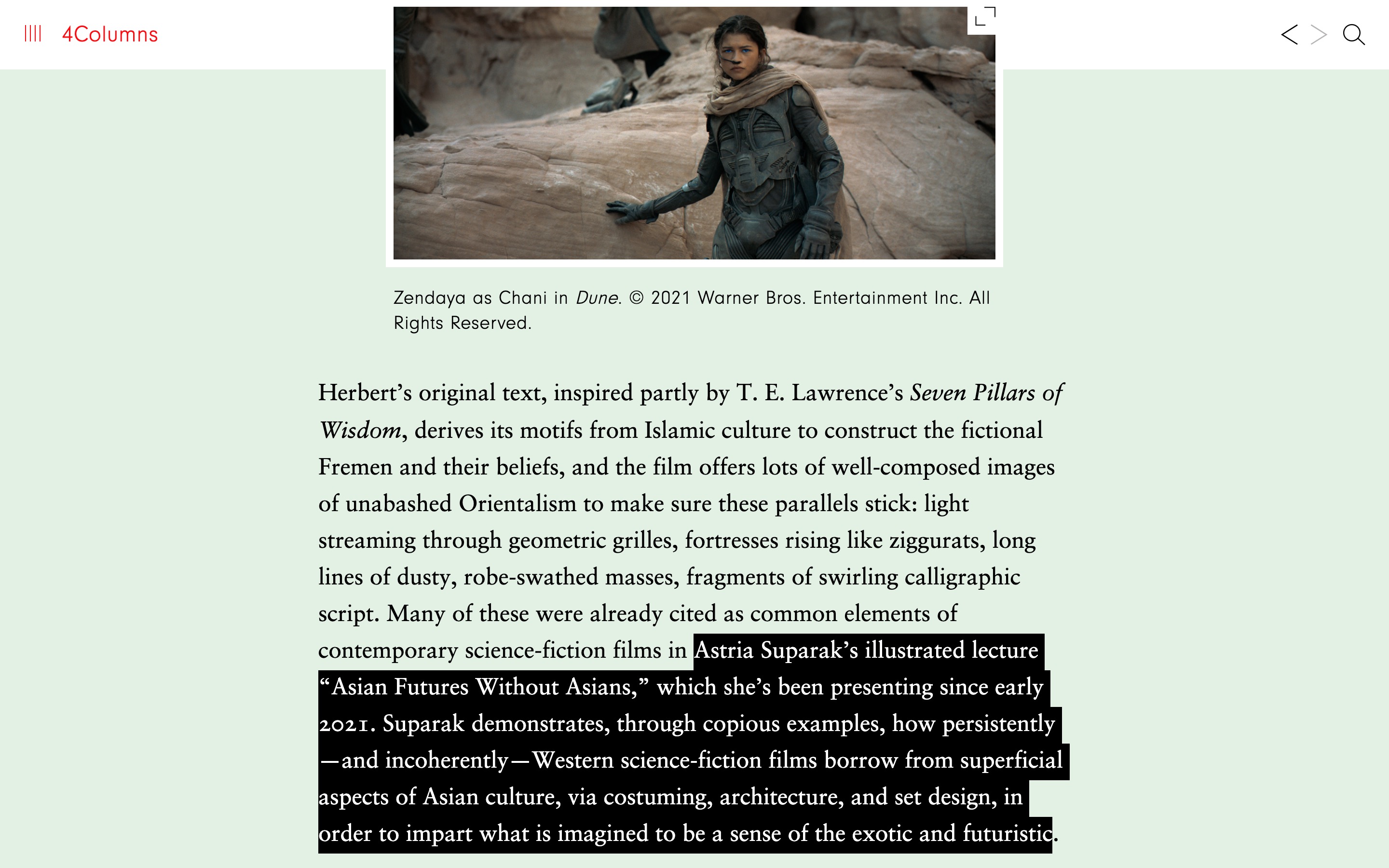 “[Frank] Herbert’s original text [Dune], inspired partly by T. E. Lawrence’s Seven Pillars of Wisdom, derives its motifs from Islamic culture to construct the fictional Fremen and their beliefs, and the film offers lots of well-composed images of unabashed Orientalism to make sure these parallels stick: light streaming through geometric grilles, fortresses rising like ziggurats, long lines of dusty, robe-swathed masses, fragments of swirling calligraphic script. Many of these were already cited as common elements of contemporary science-fiction films in Astria Suparak’s illustrated lecture “Asian Futures Without Asians,” which she’s been presenting since early 2021. Suparak demonstrates, through copious examples, how persistently—and incoherently—Western science-fiction films borrow from superficial aspects of Asian culture, via costuming, architecture, and set design, in order to impart what is imagined to be a sense of the exotic and futuristic.