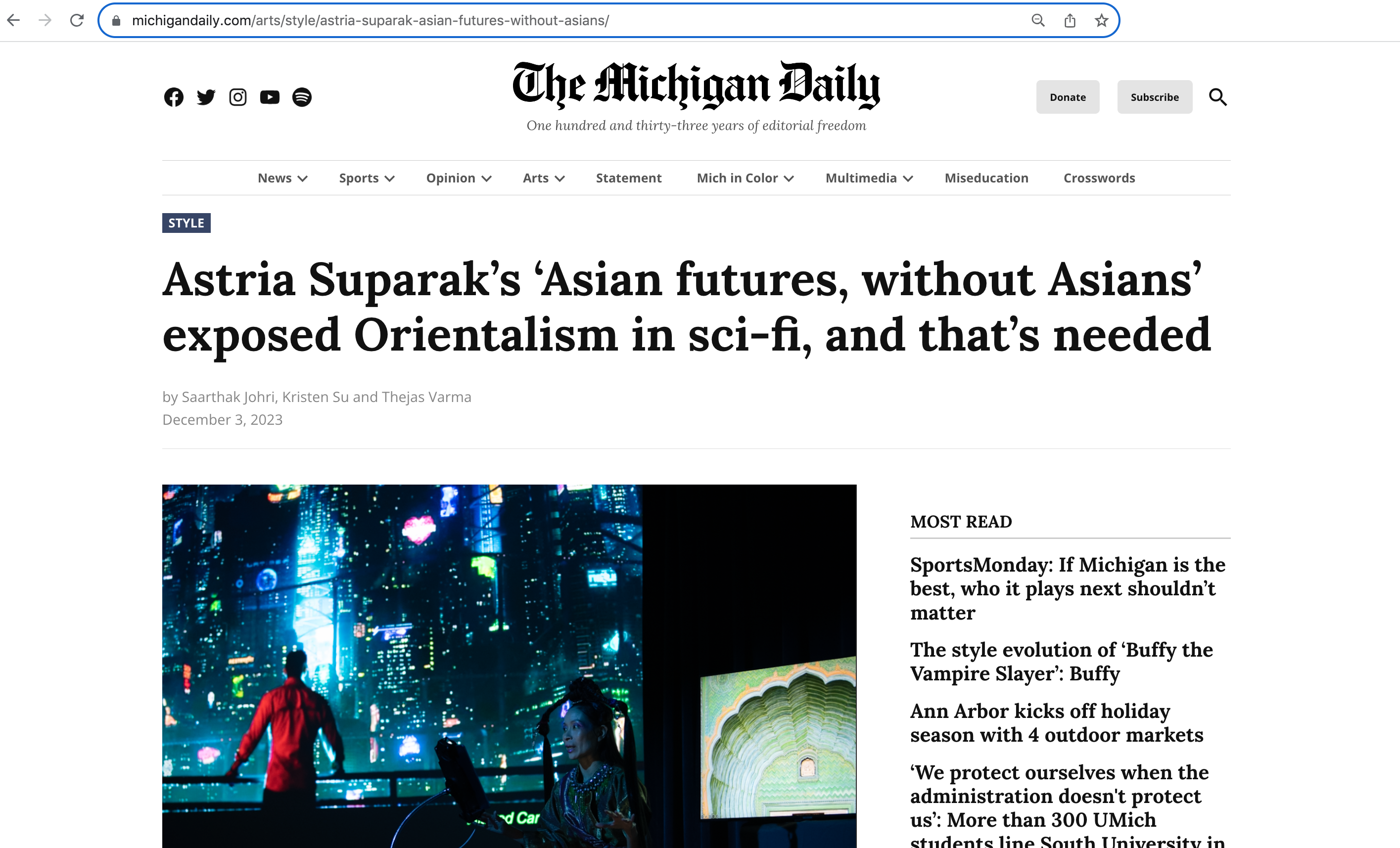 THE MICHIGAN DAILY, “Astria Suparak’s ‘Asian futures, without Asians’ exposed Orientalism in sci-fi, and that’s needed,” Saarthak Johri, Kristen Su and Thejas Varma, Dec. 3, 2023
