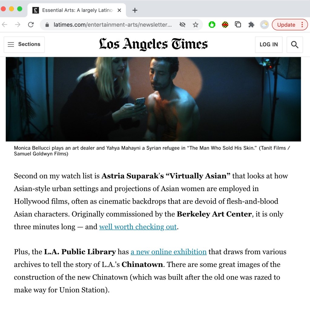 Second on my watch list is Astria Suparak’s “Virtually Asian” that looks at how Asian-style urban settings and projections of Asian women are employed in Hollywood films, often as cinematic backdrops that are devoid of flesh-and-blood Asian characters. Originally commissioned by the Berkeley Art Center, it is only three minutes long — and well worth checking out.