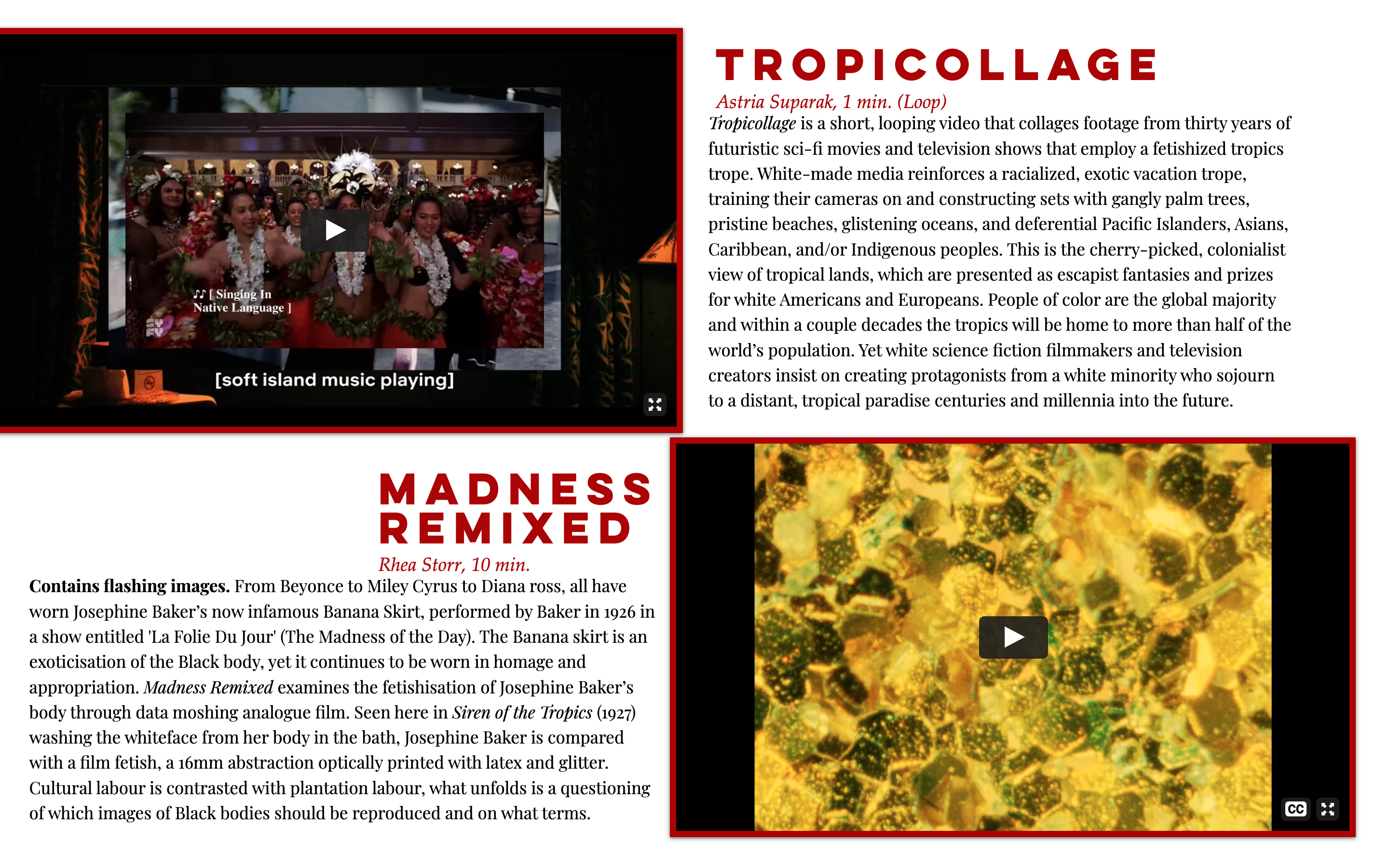 Tropicollage is a short, looping video that collages footage from thirty years of futuristic sci-fi movies and television shows that employ a fetishized tropics trope. Commissioned by Other Futures, it is one part of Astria Suparakโs ongoing research project, Asian futures, without Asians.