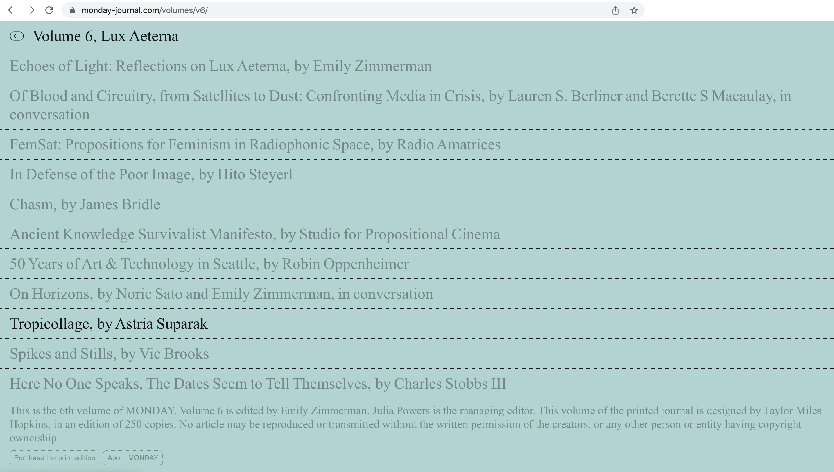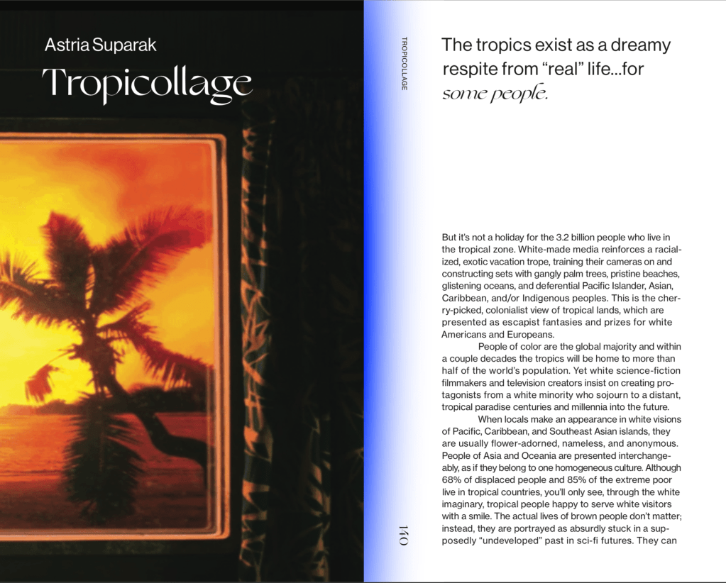 MONDAY, Vol. 6 extends the themes and inquiries of the 2021 exhibition Lux Aeterna, considering how technological, economic, and cultural forces shape the ways we produce, share, and experience media โ and how that media in turn influences our values and aesthetics. The issue includes a full color, 10-page spread visual essay version of Suparak’s Tropicollage.