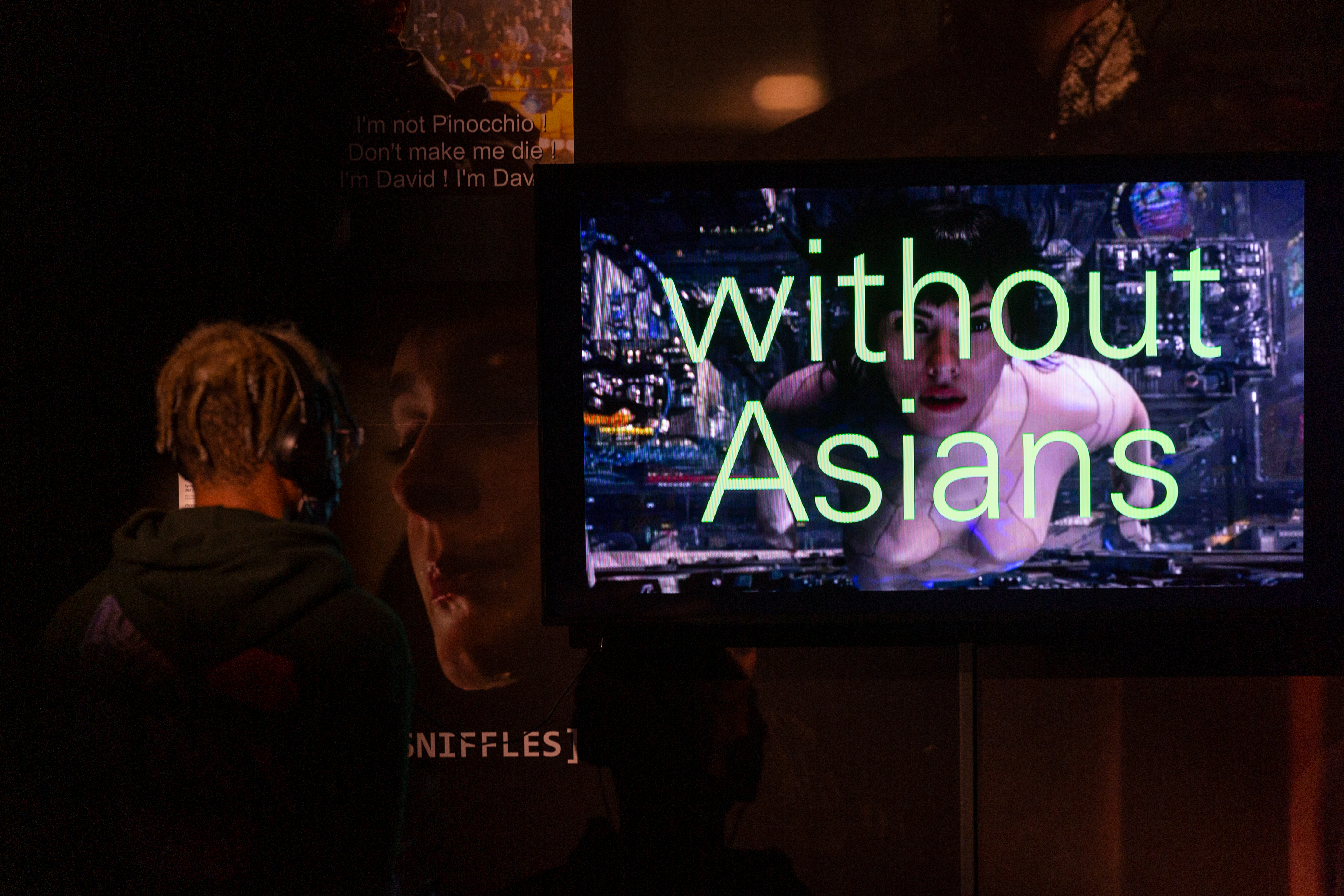 EF_SWR_with viewer3_Suparak September 29, 2021 Return to: SYMPATHETIC WHITE ROBOTSFull resolution (5760 × 3840) Image navigation Previous Image Next Image Visitor looking at "Sympathetic White Robots (and Cyborgs)" by Astria Suparak in Encoding Futures: Critical Imaginaries of AI, Oxy Arts, 2021.
