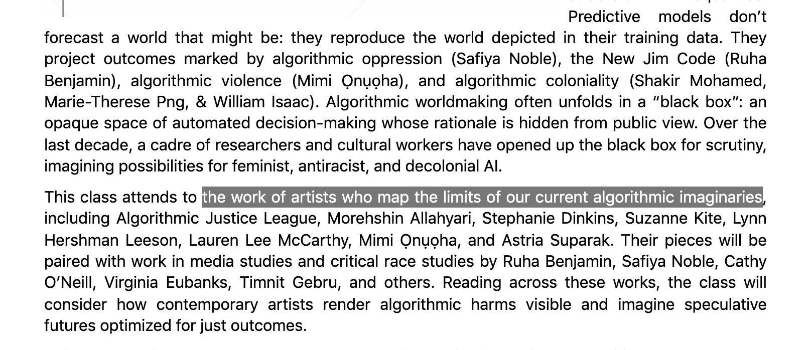 Syllabus2_artists September 29, 2021 Return to: SYMPATHETIC WHITE ROBOTSFull resolution (1616 × 698) Image navigation Previous Image Next Image Screenshot of syllabus for “Art, AI, & The Aesthetics of Algorithmic Justice” (Mashinka Firunts Hakopian).