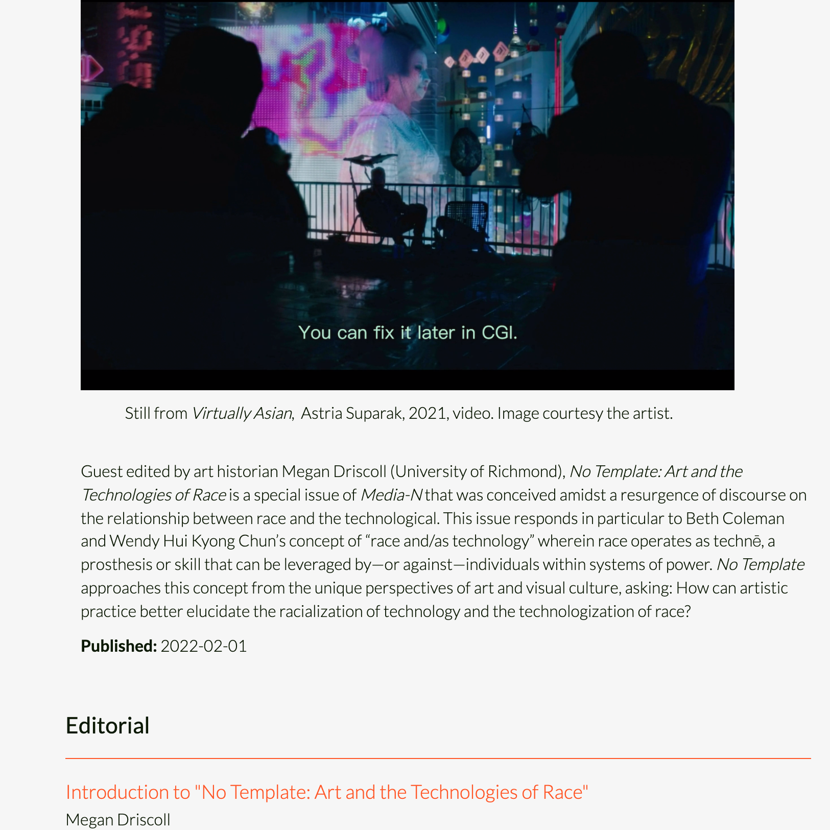 Guest edited by art historian Megan Driscoll (University of Richmond), No Template: Art and the Technologies of Race is a special issue of Media-N that was conceived amidst a resurgence of discourse on the relationship between race and the technological. This issue responds in particular to Beth Coleman and Wendy Hui Kyong Chun’s concept of “race and/as technology” wherein race operates as technē, a prosthesis or skill that can be leveraged by—or against—individuals within systems of power. No Template approaches this concept from the unique perspectives of art and visual culture, asking: How can artistic practice better elucidate the racialization of technology and the technologization of race?