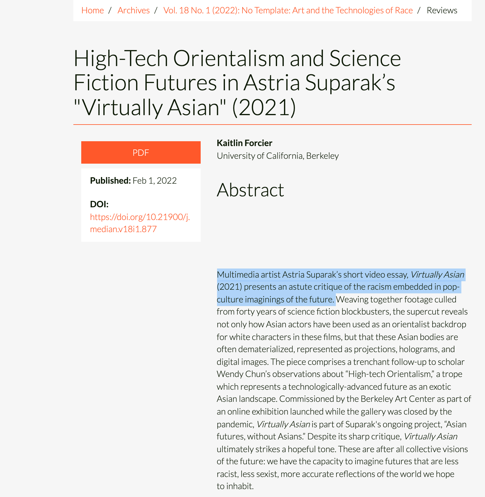 “High-Tech Orientalism and Science Fiction Futures in Astria Suparak’s ‘Virtually Asian’ (2021)”