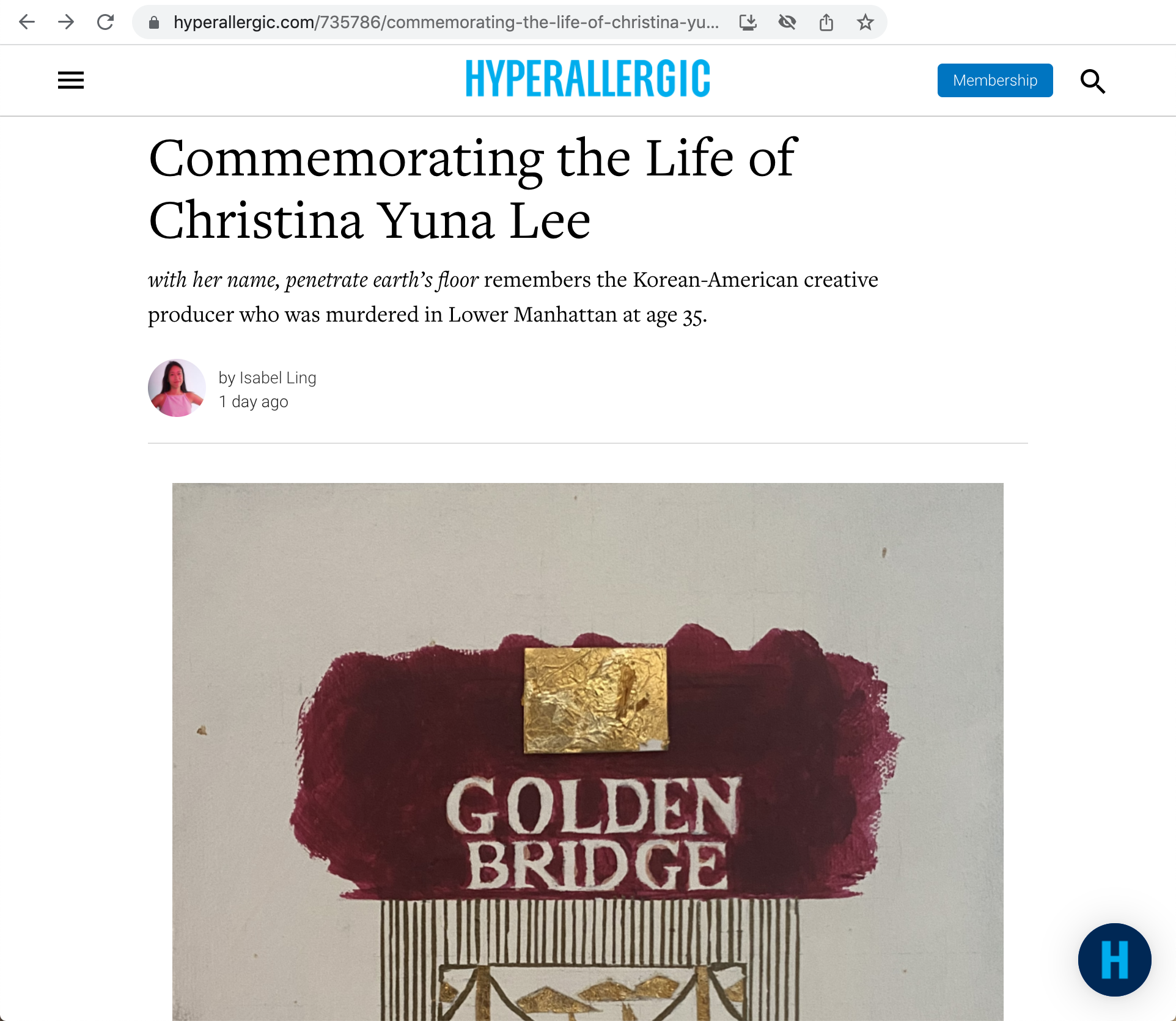 HYPERALLERGIC, “Commemorating the Life of Christina Yuna Lee,” Isabel Ling, May 30, 2022