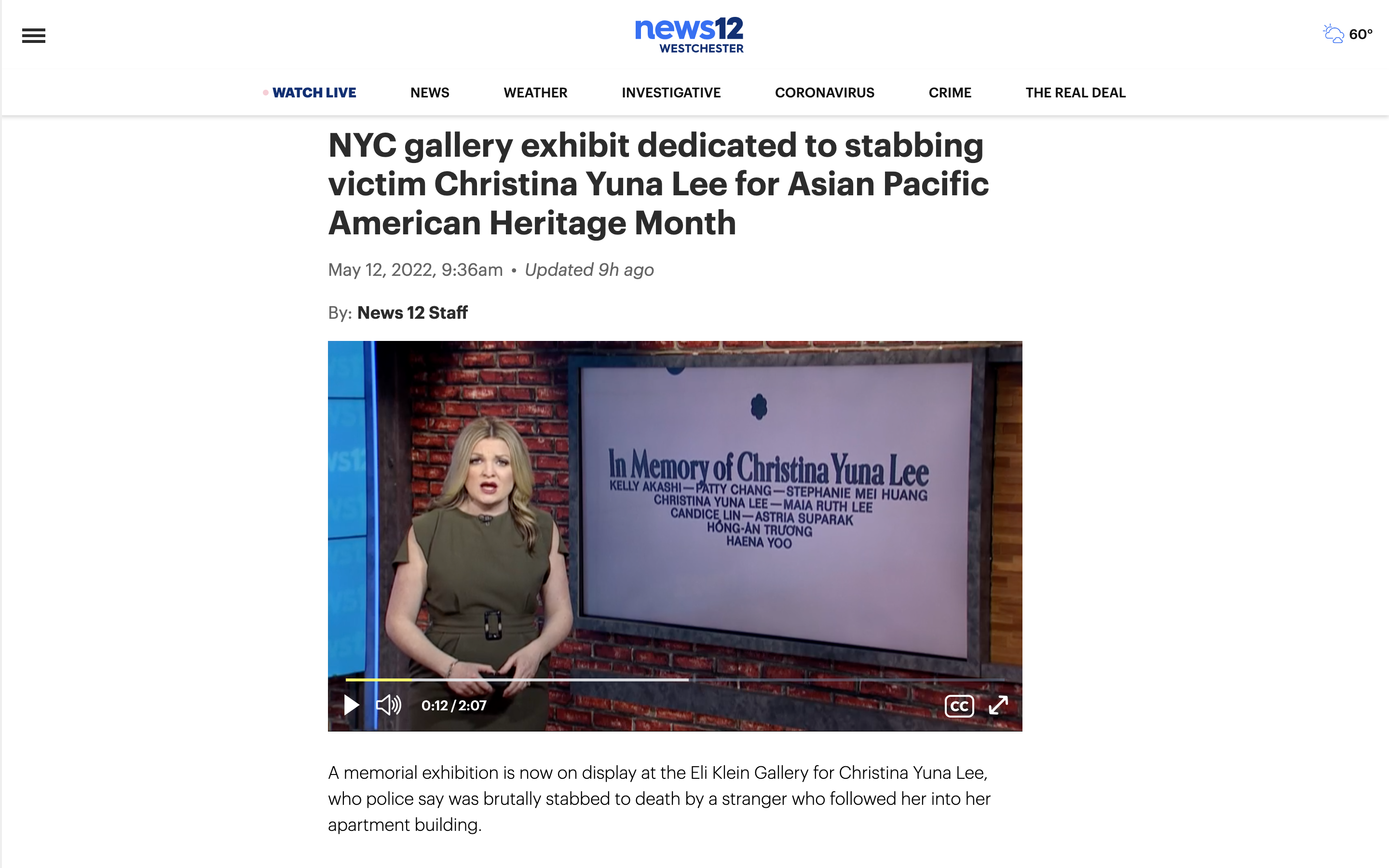 News 12 Westchester, “NYC gallery exhibit dedicated to stabbing victim Christina Yuna Lee,” May 12, 2022