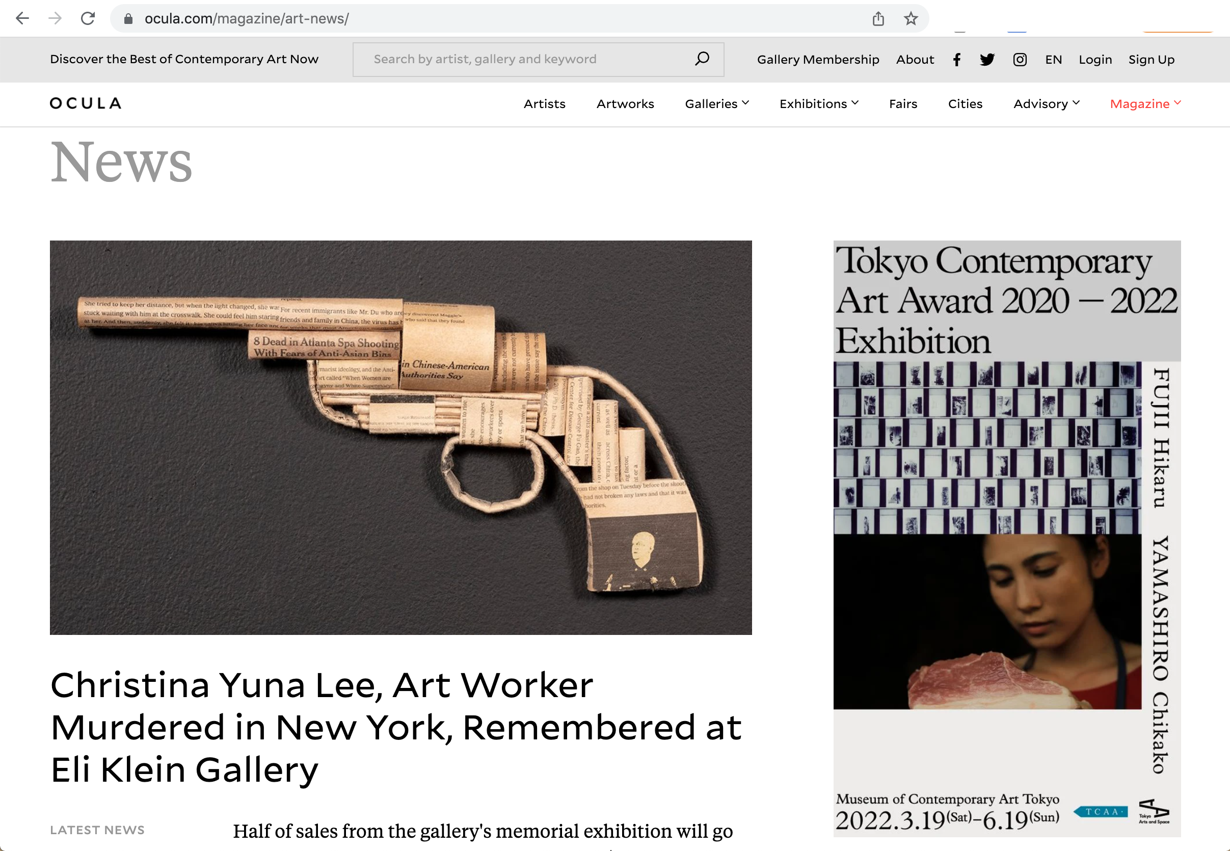 OCULA: “Christina Yuna Lee, Art Worker Murdered in New York, Remembered at Eli Klein Gallery,” Sam Gaskin, April 11, 2022