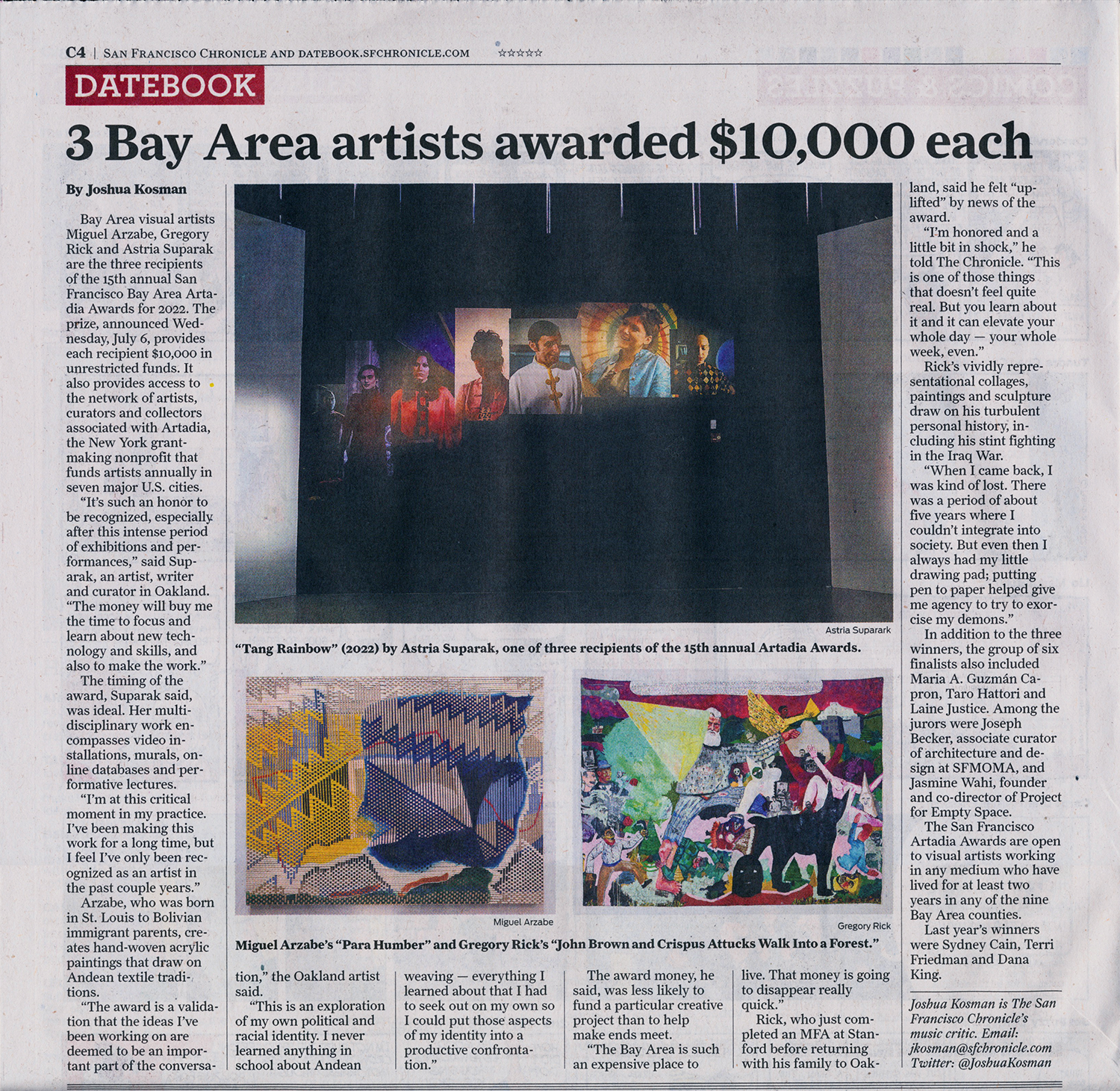 SAN FRANCISCO CHRONICLE, “3 Bay Area visual artists win 2022 Artadia Awards,” Joshua Kosman, July 6, 2022 (print edition July 23, 2022)