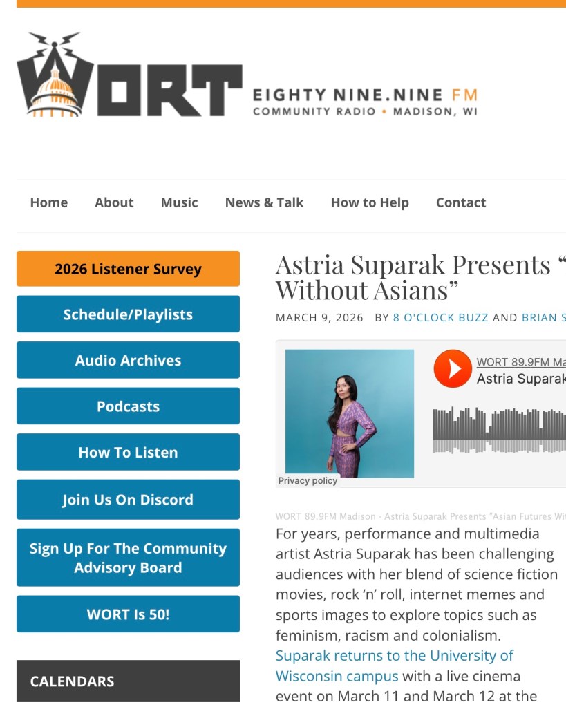 WORT Radio, “Astria Suparak Presents ‘Asian Futures Without Asians,'” 8 o’Clock Buzz and Brian Standing, March 9, 2026