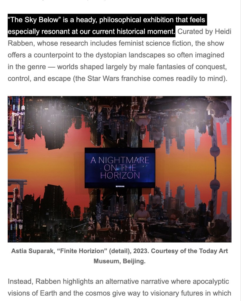 KQED, “In ‘The Sky Below,’ Artists Depict Futures Worth Sticking Around For,” Sarah Hotchkiss, July 23, 2025