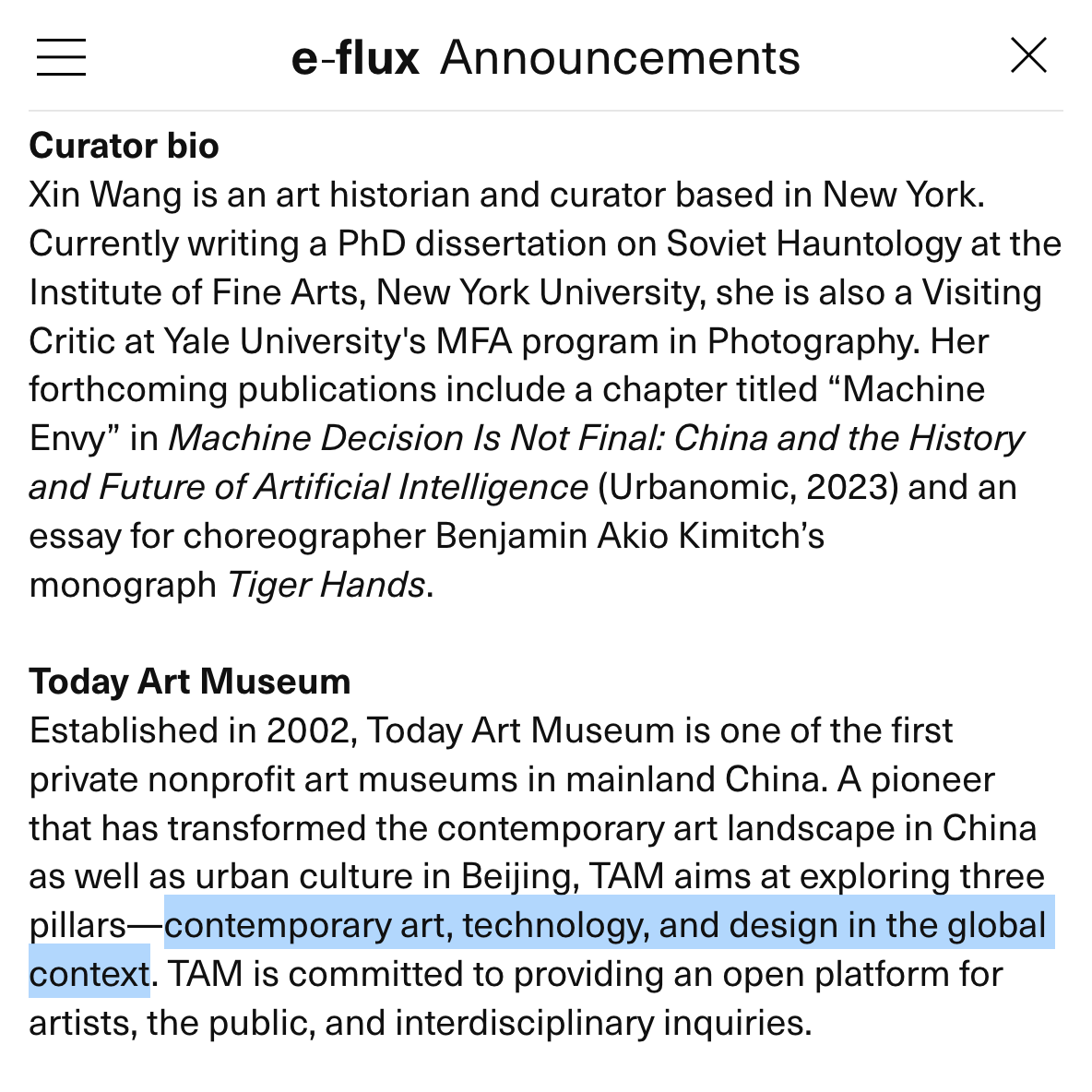 Special commissions from artists Tishan Hsu, Morehshin Allahyari, and Astria Suparak. Public programs include lectures and workshops with artists Li Jiabao, Liu Xin, and zzyw, as well as a book launch with NYU Shanghai for Machine Decision Is Not Final: China and the History and Future of Artificial Intelligence (Urbanomic, 2023).