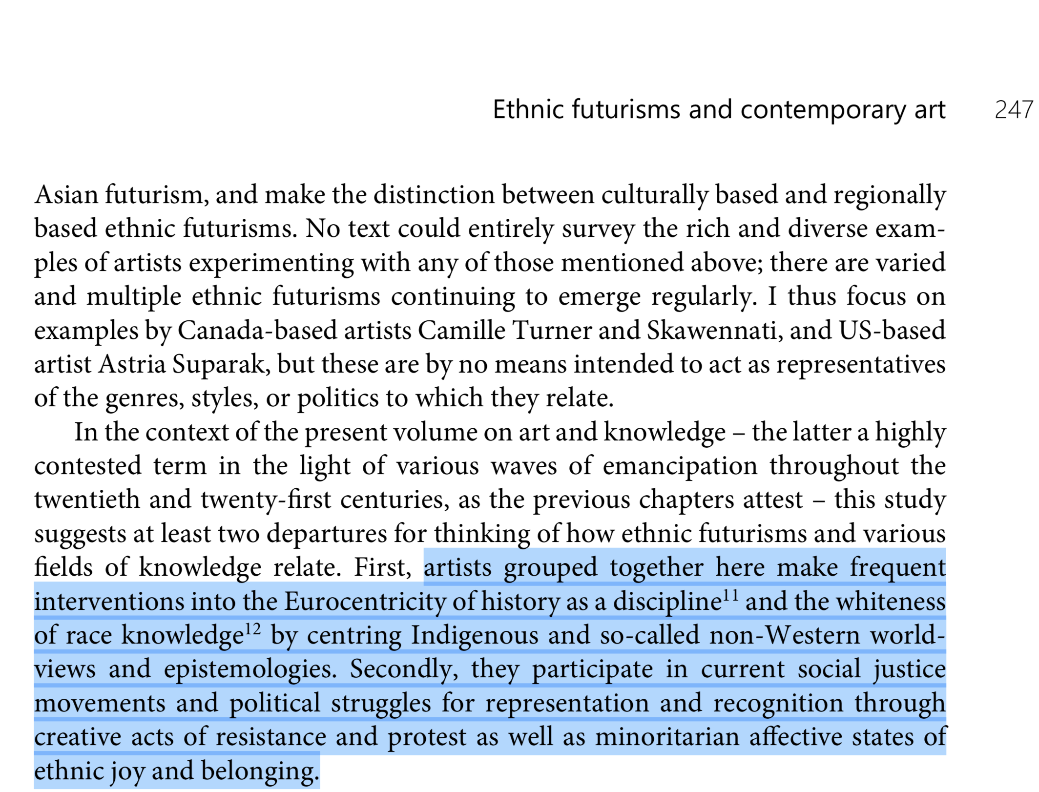 “In the context of the present volume on art and knowledge โ the latter a highly contested term in the light of various waves of emancipation throughout the twentieth and twenty-first centuries, as the previous chapters attest โ this study suggests at least two departures for thinking of how ethnic futurisms and various fields of knowledge relate. First, artists grouped together here make frequent interventions into the Eurocentricity of history as a discipline and the whiteness of race knowledge by centring Indigenous and so-called non-Western worldviews and epistemologies. Secondly, they participate in current social justice movements and political struggles for representation and recognition through creative acts of resistance and protest as well as minoritarian affective states of ethnic joy and belonging. […]