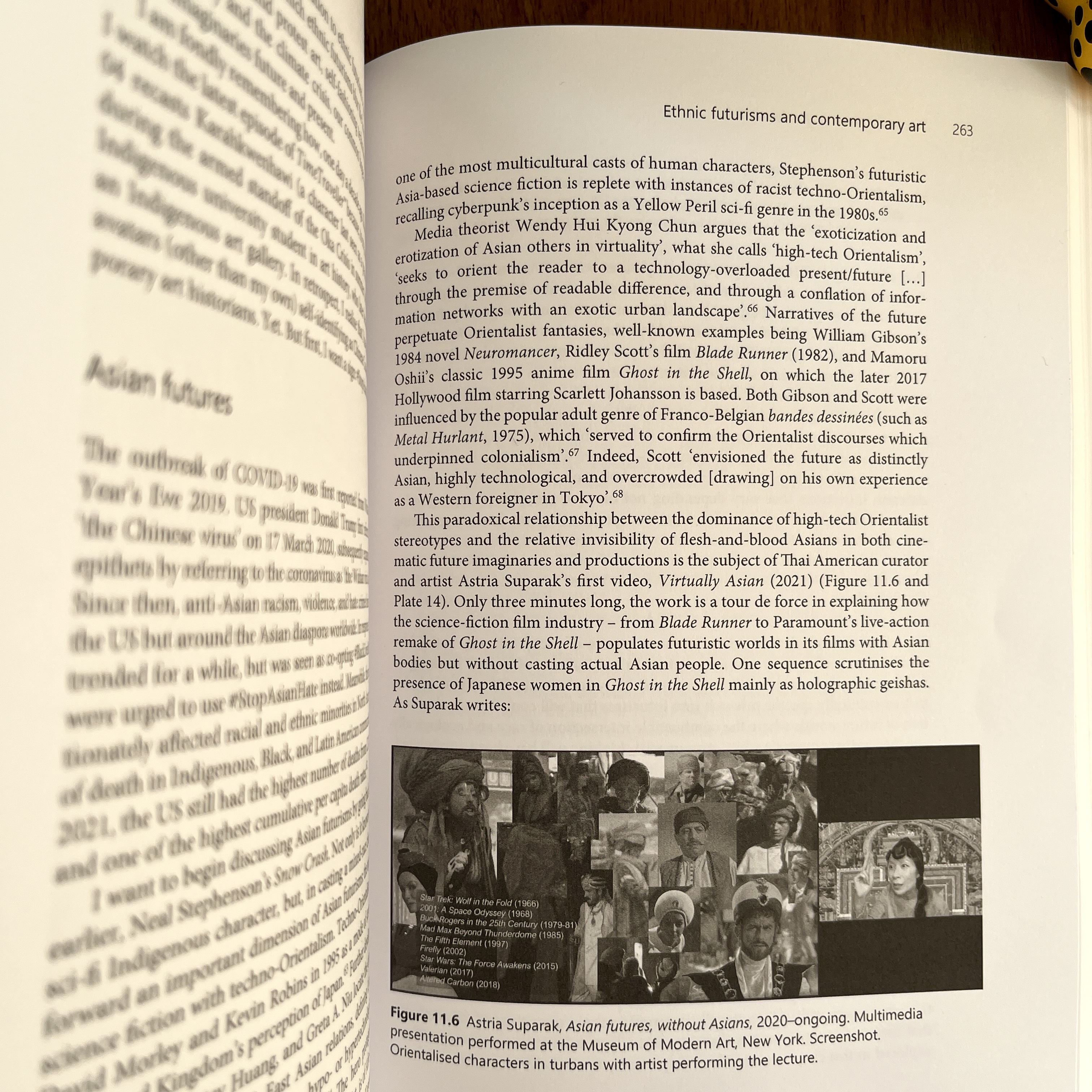 “This paradoxical relationship between the dominance of high-tech Orientalist stereotypes and the relative invisibility of flesh-and-blood Asians in both cinematic future imaginaries and productions is the subject of Thai American curator and artist Astria Suparakโs first video, Virtually Asian (2021) (Figure 11.6 and Plate 14). Only three minutes long, the work is a tour de force in explaining how the science-fiction film industry โ from Blade Runner to Paramountโs live-action remake of Ghost in the Shell โ populates futuristic worlds in its films with Asian bodies but without casting actual Asian people. One sequence scrutinises the presence of Japanese women in Ghost in the Shell mainly as holographic geishas. As Suparak writes: