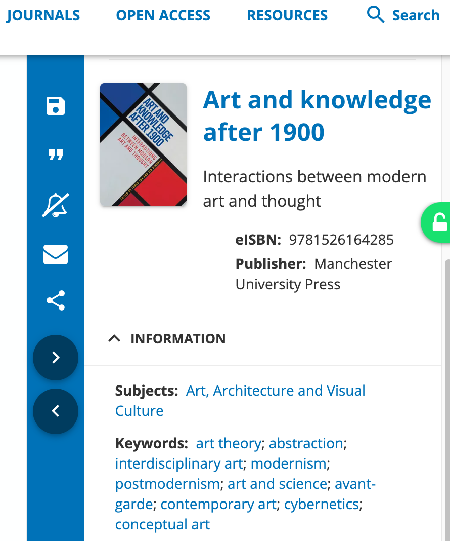 The publication explores the relationship between art and knowledge from the beginning of the twentieth century to the present day. Each chapter examines artistic responses to a particular discipline of knowledge, from quantum theory and theosophy to cybernetics and ethnic futurisms. The authors argue that art’s incursion into other intellectual disciplines is a defining characteristic of both modernism and postmodernism. Throughout, the volume poses a series of larger questions: is art a source of knowledge? If so, what kind of knowledge? And, ultimately, can it contribute to our understanding of the world in ways that thinkers from other fields should take seriously?