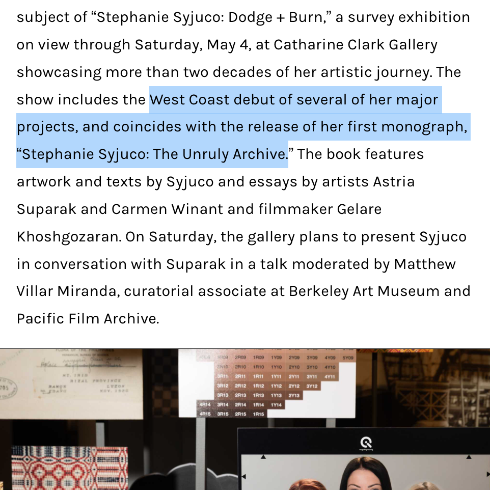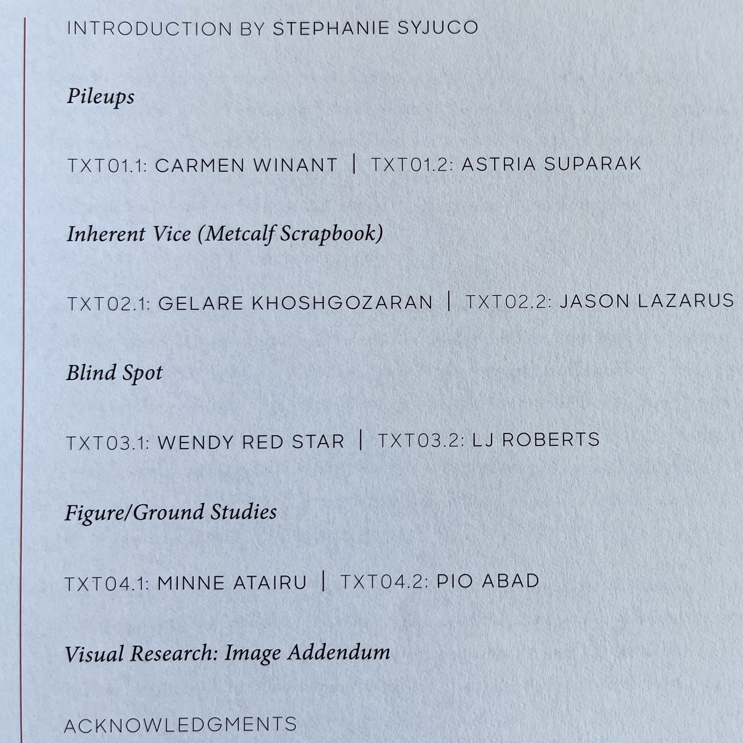 Stephanie Syjuco invited nine artists to contribute short essays about their own work with archives as part of The Unruly Archive: Pio Abad, Minne Atairu, Gelare Khoshgozaran, Jason Lazarus, Wendy Red Star, LJ Roberts, Astria Suparak, Carmen Winant, and Savannah Wood.