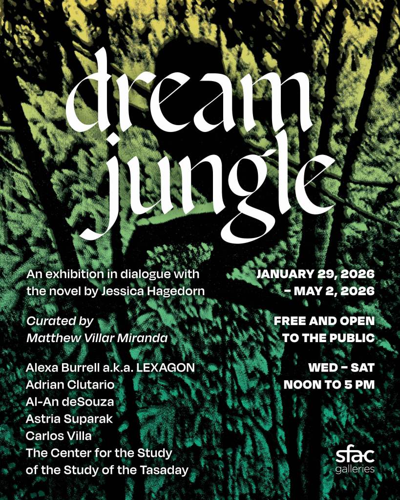 Curated by Matthew Villar Miranda, the exhibition features work by Alexa Burrell a.k.a. LEXAGON, adrian clutario, Al-An deSouza, Astria Suparak, and Carlos Villa, along with archival holdings from The Center for the Study of the Study of the Tasaday and the Jessica Hagedorn Papers.