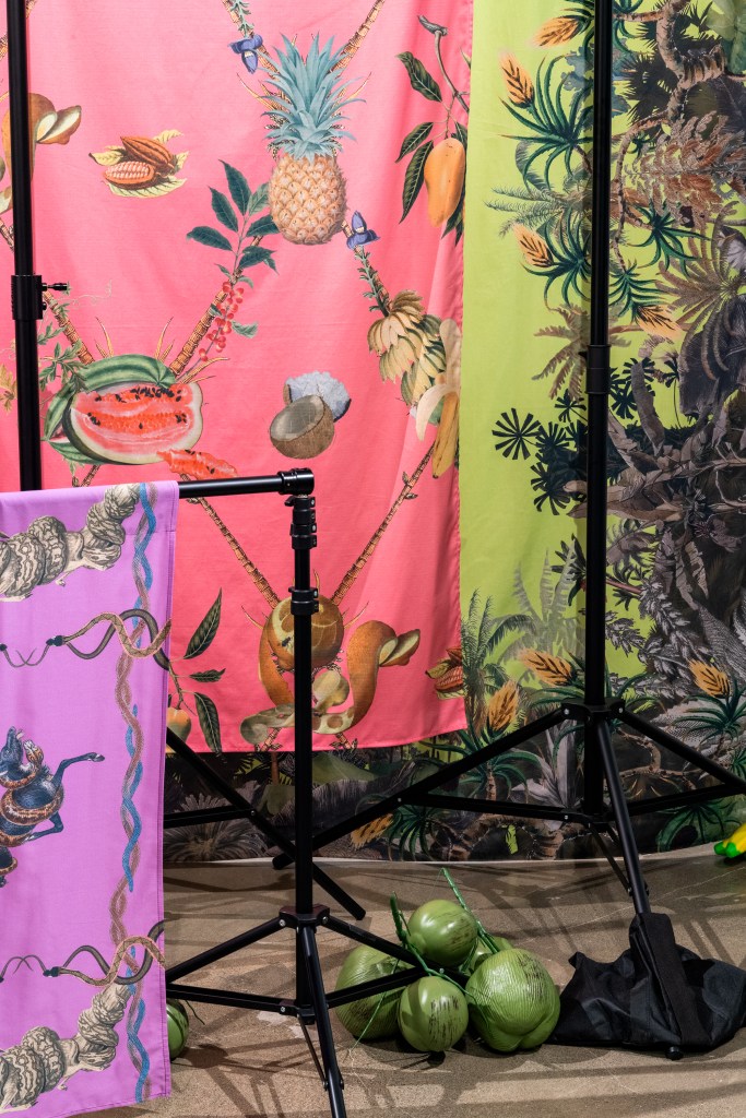 Drawing on Dutch still-life painting, naturalist illustration, expedition imagery, imperial propaganda, and commercial packaging, Suparak composites hundreds of flora and fauna into layered fabric banners. Snakes coil around prey; a throng of brightly feathered birds erupts into flight above, while fanciful fruits swell into bloated cornucopias. Stripped from their original contexts, these images accumulate into ornamental fields rather than rational landscapes.