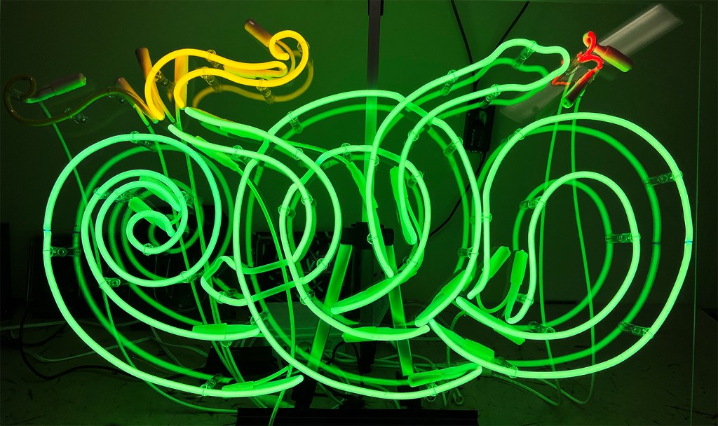 Neon, animated transformers, plexiglass, 48 x 28 x 3 inches.